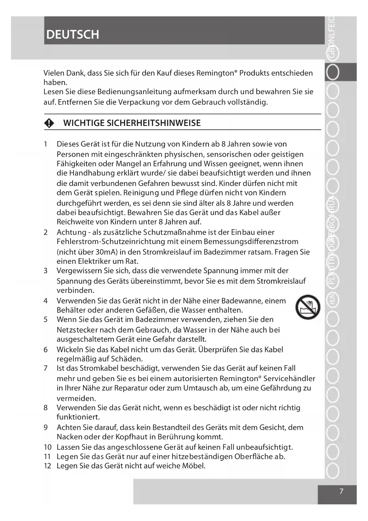 To avoid environmental and health problems due to hazardous substances in electrical and electronic goods, appliances marked with this symbol must not be disposed of with unsorted municipal waste, but recovered, reused or recycled.7 DEUTSCH GBDNLFEIDKSFINPSKCZ HUN PLRUTRROGRSIBG HRUAAE Vielen Dank, dass Sie sich für den Kauf dieses Remington® Produkts entschieden haben. Lesen Sie diese Bedienungsanleitung aufmerksam durch und bewahren Sie sie auf. Entfernen Sie die Verpackung vor dem Gebrauch vollständig.
