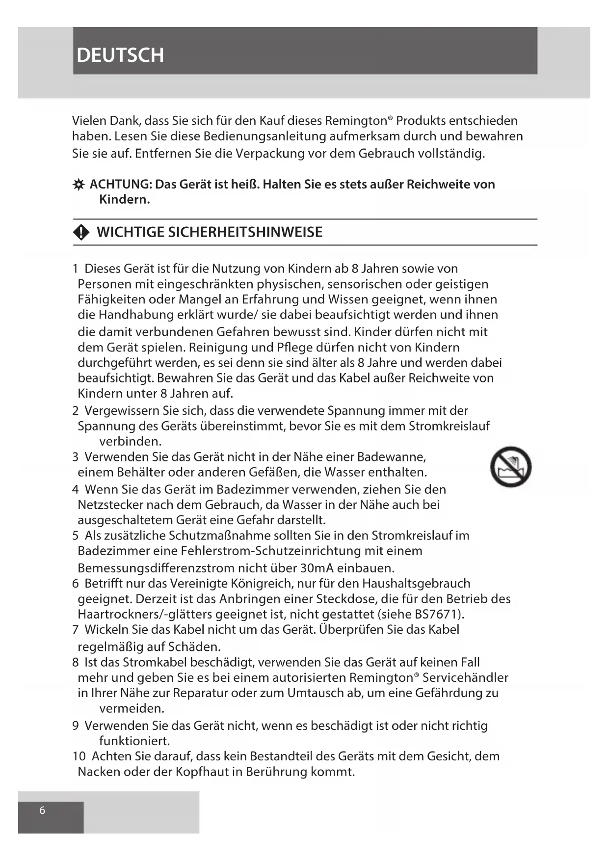 To avoid environmental and health problems due to hazardous substances in electrical and electronic goods, appliances marked with this symbol must not be disposed of with unsorted municipal waste, but recovered, reused or recycled. ENGLISH GBDNLFEIDKSFINPSKCZ HUN PLRUTRROGRSI AE HR UA6 Vielen Dank, dass Sie sich für den Kauf dieses Remington® Produkts entschieden haben. Lesen Sie diese Bedienungsanleitung aufmerksam durch und bewahren Sie sie auf. Entfernen Sie die Verpackung vor dem Gebrauch vollständig. , ACHTUNG: Das Gerät ist heiß. Halten Sie es stets außer Reichweite von Kindern.