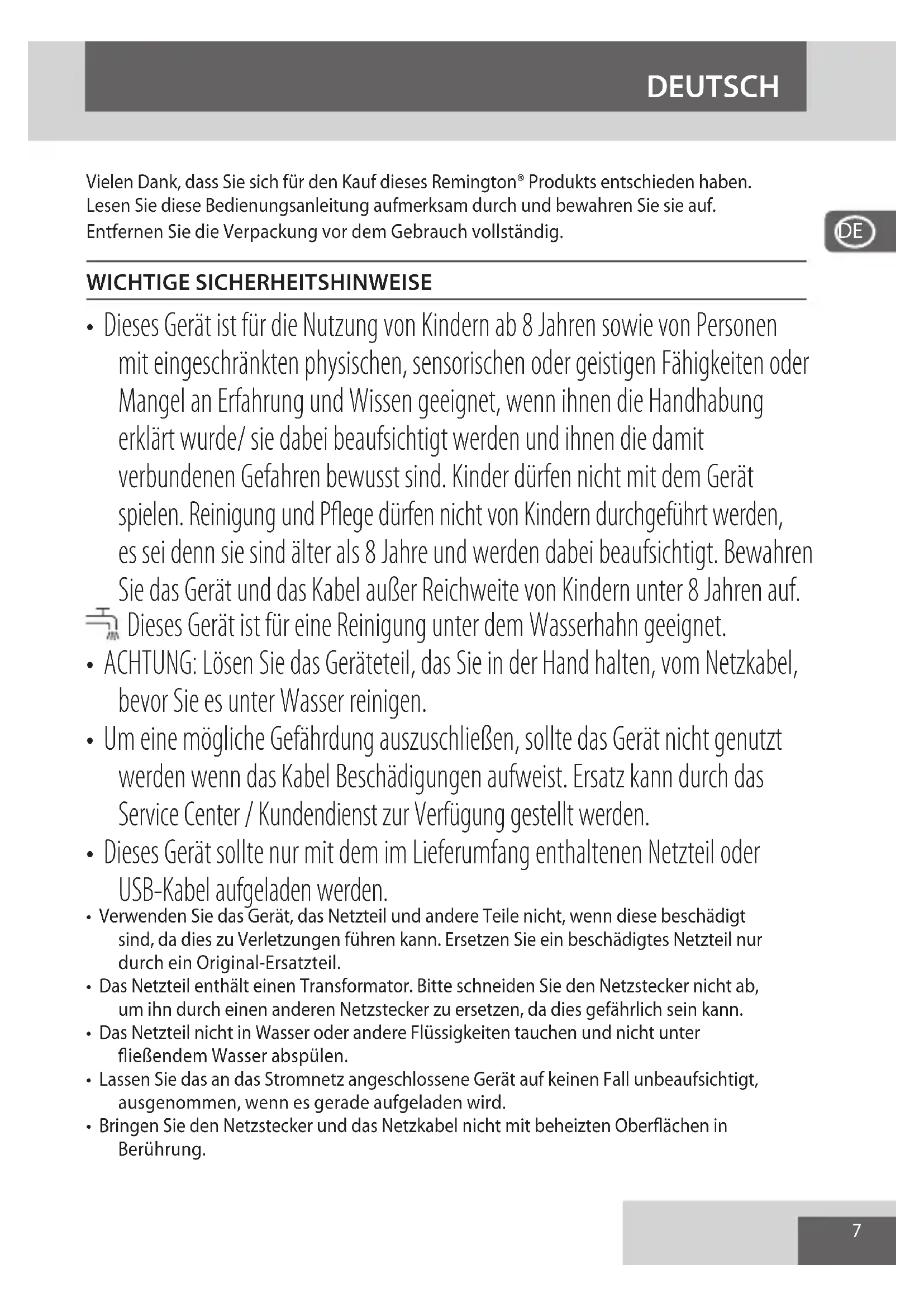 Vielen Dank, dass Sie sich für den Kauf diesen Remington® Produkts entschieden haben. Lesen Sie diese Bedienungsanleitung aufmerksam durch und bewahren Sie sie auf. Entfernen Sie die Verpackung vor dem Gebrauch vollständig.