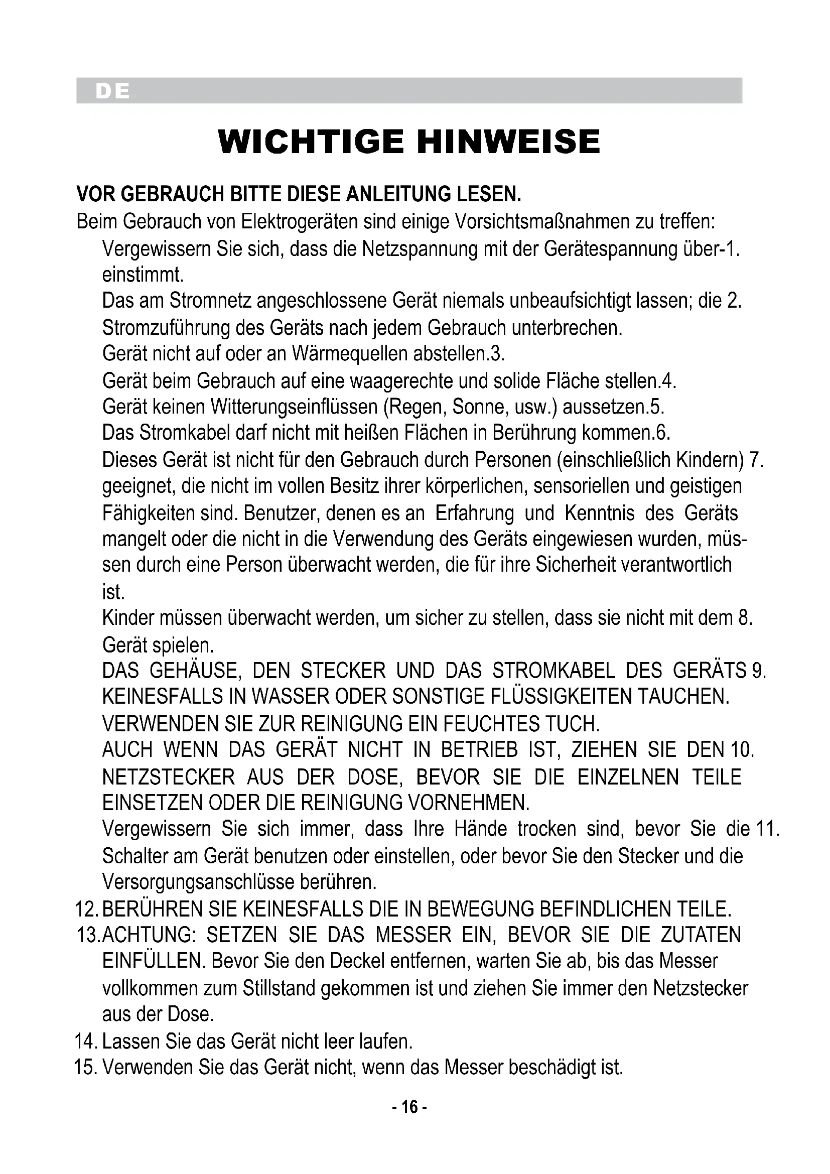 WICHTIGE HINWEISE VOR GEBRAUCH BITTE DIESE ANLEITUNG LESEN. Beim Gebrauch von Elektrogeräten sind einige Vorsichtsmaßnahmen zu treffen: Vergewissern Sie sich, dass die Netzspannung mit der Gerätespannung über-1. einstimmt. Das am Stromnetz angeschlossene Gerät niemals unbeaufsichtigt lassen; die 2. Stromzuführung des Geräts nach jedem Gebrauch unterbrechen. Gerät nicht auf oder an Wärmequellen abstellen.3. Gerät beim Gebrauch auf eine waagerechte und solide Fläche stellen.4. Gerät keinen Witterungseinflüssen (Regen, Sonne, usw.) aussetzen.5. Das Stromkabel darf nicht mit heißen Flächen in Berührung kommen.6. Dieses Gerät ist nicht für den Gebrauch durch Personen (einschließlich Kindern) 7. geeignet, die nicht im vollen Besitz ihrer körperlichen, sensoriellen und geistigen Fähigkeiten sind. Benutzer, denen es an Erfahrung und Kenntnis des Geräts mangelt oder die nicht in die Verwendung des Geräts eingewiesen wurden, müs- sen durch eine Person überwacht werden, die für ihre Sicherheit verantwortlich ist. Kinder müssen überwacht werden, um sicher zu stellen, dass sie nicht mit dem 8. Gerät spielen. DAS GEHÄUSE, DEN STECKER UND DAS STROMKABEL DES GERÄTS 9. KEINESFALLS IN WASSER ODER SONSTIGE FLÜSSIGKEITEN TAUCHEN. VERWENDEN SIE ZUR REINIGUNG EIN FEUCHTES TUCH. AUCH WENN DAS GERÄT NICHT IN BETRIEB IST, ZIEHEN SIE DEN 10. NETZSTECKER AUS DER DOSE, BEVOR SIE DIE EINZELNEN TEILE EINSETZEN ODER DIE REINIGUNG VORNEHMEN. Vergewissern Sie sich immer, dass Ihre Hände trocken sind, bevor Sie die 11. Schalter am Gerät benutzen oder einstellen, oder bevor Sie den Stecker und die Versorgungsanschlüsse berühren. BERÜHREN SIE KEINESFALLS DIE IN BEWEGUNG BEFINDLICHEN TEILE.12. ACHTUNG: SETZEN SIE DAS MESSER EIN, BEVOR SIE DIE ZUTATEN 13. EINFÜLLEN. Bevor Sie den Deckel entfernen, warten Sie ab, bis das Messer vollkommen zum Stillstand gekommen ist und ziehen Sie immer den Netzstecker aus der Dose. Lassen Sie das Gerät nicht leer laufen.14. Verwenden Sie das Gerät nicht, wenn das Messer beschädigt ist.15.DE