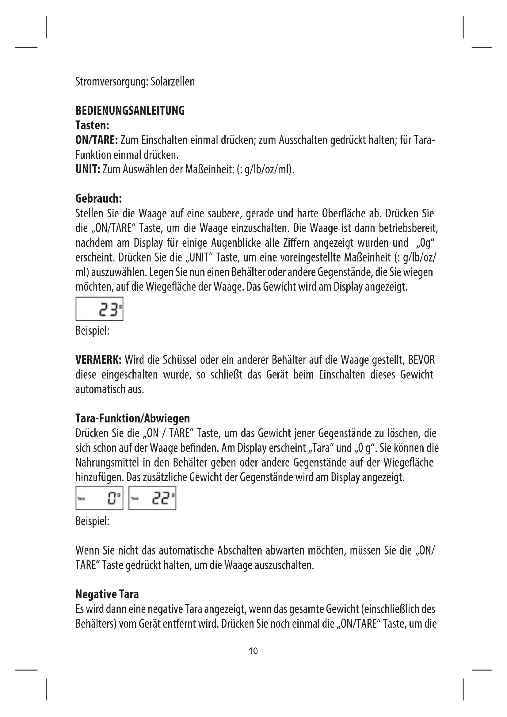 Stromversorgung: Solarzellen BEDIENUNGSANLEITUNG Tasten: ON/TARE: Zum Einschalten einmal drücken; zum Ausschalten gedrückt halten; für Tara- Funktion einmal drücken. UNIT: Zum Auswählen der Maßeinheit: (: g/lb/oz/ml). Gebrauch: Stellen Sie die Waage auf eine saubere, gerade und harte Oberäche ab. Drücken Sie die „ON/TARE“ Taste, um die Waage einzuschalten. Die Waage ist dann betriebsbereit, nachdem am Display für einige Augenblicke alle Ziern angezeigt wurden und „0g“ erscheint. Drücken Sie die „UNIT“ Taste, um eine voreingestellte Maßeinheit (: g/lb/oz/ ml) auszuwählen. Legen Sie nun einen Behälter oder andere Gegenstände, die Sie wiegen möchten, auf die Wiegeäche der Waage. Das Gewicht wird am Display angezeigt. Beispiel: VERMERK: Wird die Schüssel oder ein anderer Behälter auf die Waage gestellt, BEVOR diese eingeschalten wurde, so schließt das Gerät beim Einschalten dieses Gewicht automatisch aus. Tara-Funktion/Abwiegen Drücken Sie die „ON / TARE“ Taste, um das Gewicht jener Gegenstände zu löschen, die sich schon auf der Waage benden. Am Display erscheint „Tara“ und „0 g“. Sie können die Nahrungsmittel in den Behälter geben oder andere Gegenstände auf der Wiegeäche hinzufügen. Das zusätzliche Gewicht der Gegenstände wird am Display angezeigt. Beispiel: Wenn Sie nicht das automatische Abschalten abwarten möchten, müssen Sie die „ON/ TARE“ Taste gedrückt halten, um die Waage auszuschalten. Negative Tara Es wird dann eine negative Tara angezeigt, wenn das gesamte Gewicht (einschließlich des Behälters) vom Gerät entfernt wird. Drücken Sie noch einmal die „ON/TARE“ Taste, um die10