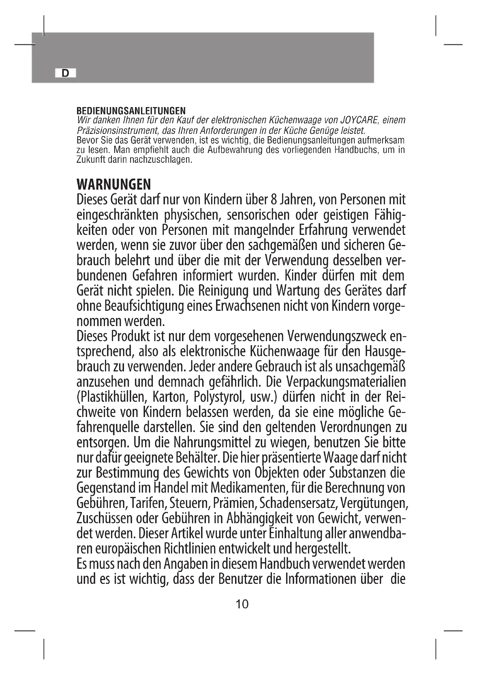 BEDIENUNGSANLEITUNGEN Wir danken Ihnen für den Kauf der elektronischen Küchenwaage von JOYCARE, einem Präzisionsinstrument, das Ihren Anforderungen in der Küche Genüge leistet. Bevor Sie das Gerät verwenden, ist es wichtig, die Bedienungsanleitungen aufmerksam zu lesen. Man empfiehlt auch die Aufbewahrung des vorliegenden Handbuchs, um in Zukunft darin nachzuschlagen. WARNUNGEN Dieses Gerät darf nur von Kindern über 8 Jahren, von Personen mit eingeschränkten physischen, sensorischen oder geistigen Fähig- keiten oder von Personen mit mangelnder Erfahrung verwendet werden, wenn sie zuvor über den sachgemäßen und sicheren Ge- brauch belehrt und über die mit der Verwendung desselben ver- bundenen Gefahren informiert wurden. Kinder dürfen mit dem Gerät nicht spielen. Die Reinigung und Wartung des Gerätes darf ohne Beaufsichtigung eines Erwachsenen nicht von Kindern vorge- nommen werden. Dieses Produkt ist nur dem vorgesehenen Verwendungszweck en- tsprechend, also als elektronische Küchenwaage für den Hausge- brauch zu verwenden. Jeder andere Gebrauch ist als unsachgemäß anzusehen und demnach gefährlich. Die Verpackungsmaterialien (Plastikhüllen, Karton, Polystyrol, usw.) dürfen nicht in der Rei- chweite von Kindern belassen werden, da sie eine mögliche Ge- fahrenquelle darstellen. Sie sind den geltenden Verordnungen zu entsorgen. Um die Nahrungsmittel zu wiegen, benutzen Sie bitte nur dafür geeignete Behälter. Die hier präsentierte Waage darf nicht zur Bestimmung des Gewichts von Objekten oder Substanzen die Gegenstand im Handel mit Medikamenten, für die Berechnung von Gebühren, Tarifen, Steuern, Prämien, Schadensersatz, Vergütungen, Zuschüssen oder Gebühren in Abhängigkeit von Gewicht, verwen- det werden. Dieser Artikel wurde unter Einhaltung aller anwendba- ren europäischen Richtlinien entwickelt und hergestellt. Es muss nach den Angaben in diesem Handbuch verwendet werden und es ist wichtig, dass der Benutzer die Informationen über die11