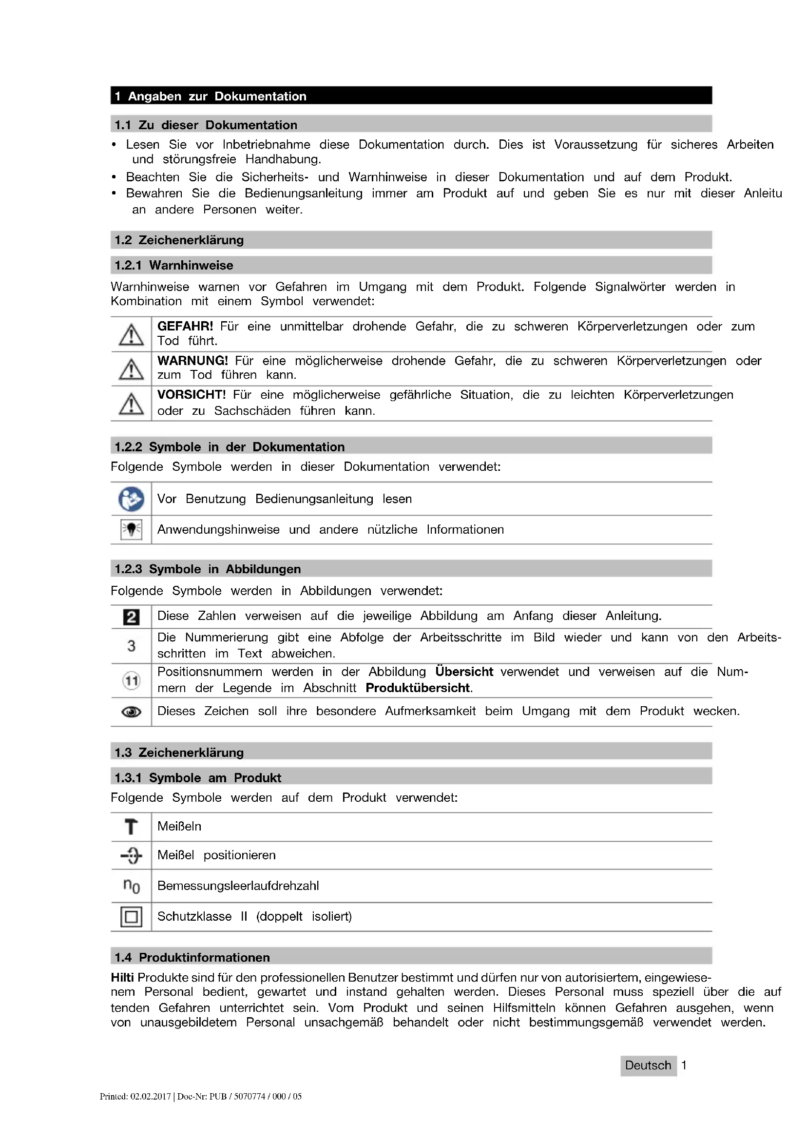 Hilti Produkte sind für den professionellen Benutzer bestimmt und dürfen nur von autorisiertem, eingewiese- nem Personal bedient, gewartet und instand gehalten werden. Dieses Personal muss speziell über die auftre- tenden Gefahren unterrichtet sein. Vom Produkt und seinen Hilfsmitteln können Gefahren ausgehen, wenn sie von unausgebildetem Personal unsachgemäß behandelt oder nicht bestimmungsgemäß verwendet werden. Printed: 02.02.2017 | Doc-Nr: PUB / 5070774 / 000 / 052 Deutsch Typenbezeichnung und Seriennummer sind auf dem Typenschild angegeben. ▶ Übertragen Sie die Seriennummer in die nachfolgende Tabelle. Die Produktangaben benötigen Sie bei Anfragen an unsere Vertretung oder Servicestelle. Produktangaben Meißelhammer TE 1500AVR Generation 01 Serien-Nr.
