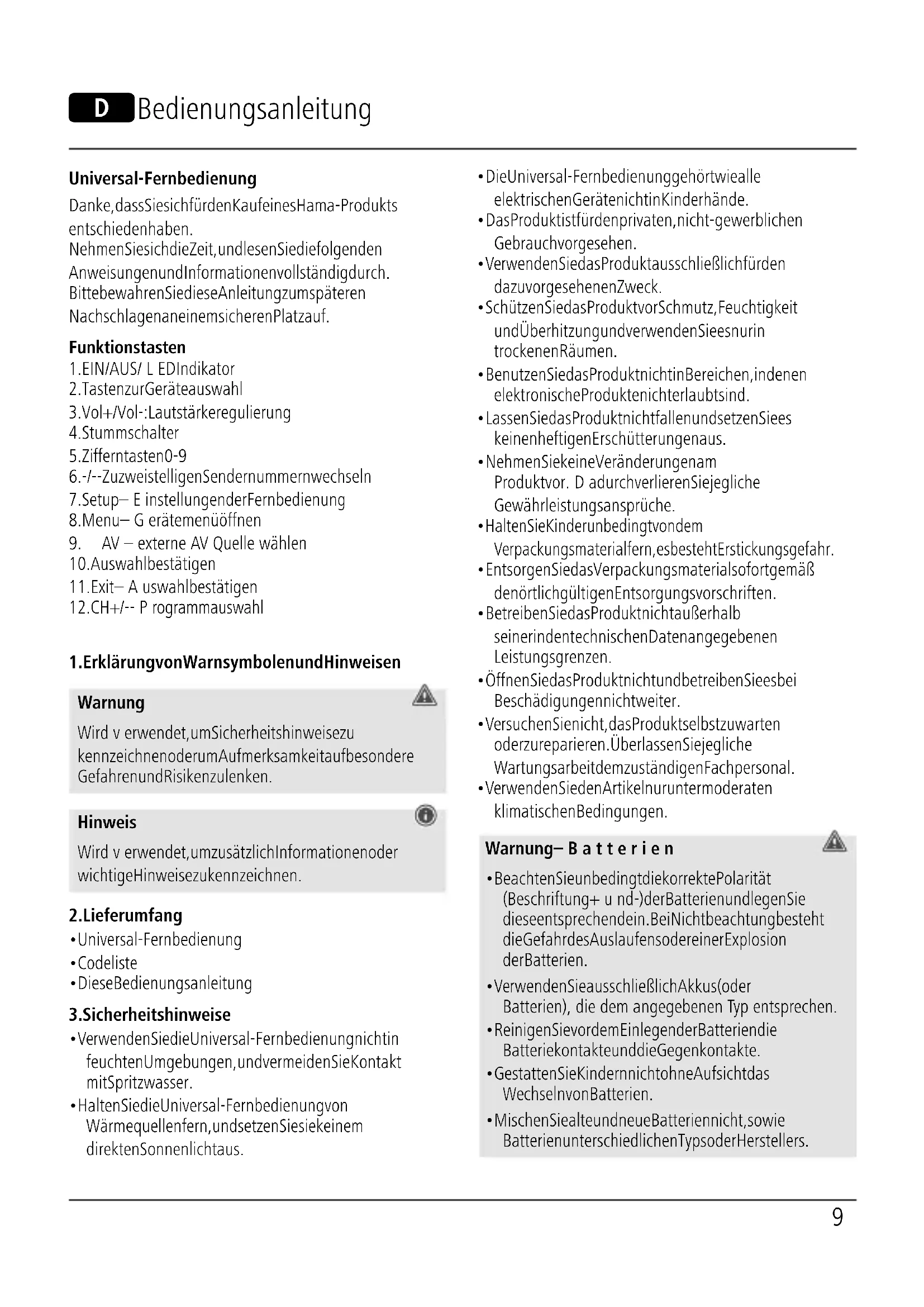 F. Meine Universal-Fernbedienung funktioniert nicht! A.Überprüfen Sie das AV-Gerät. Wenn der Hauptschalter des Geräts ausgeschaltet ist, kann die Universal- Fernbedienung das Gerät nicht bedienen. A.Überprüfen Sie, dass die Batterien korrekt eingesetzt sind und die Polarität beachtet wurde. A.Überprüfen Sie, ob Sie die entsprechende Gerätetaste für das Gerät gedrückt haben. A.Tauschen Sie die Batterien bei niedrigem Batteriestand aus. F. Wenn für die Marke meines AV-Geräts mehrere Gerätecodes aufgelistet sind, wie wähle ich den korrekten Gerätecode aus? A.Um den korrekten Gerätecode für das AV-Gerät zu bestimmen, testen Sie die Codes nacheinander,bis die meisten Tasten ordnungsgemäß funktionieren. F. Mein AV-Gerät reagiert nur auf einige Tastenbefehle. A.Probieren Sie andereCodes, bis die meisten Tasten ordnungsgemäß funktionieren. F. Die Marke meines AV-Gerätes ist nicht in der Codeliste genannt. A.Verwenden Sie in diesem Fall die manuelle Codesuche (Kapitel 5.2) oder die automatische Codesuche (Kapitel 5.3). Beim Codesuchlauf werden alle Codes für einen Gerätetyp herstellerübergreifend getestet, also z.B. alle Codes für STBReceiver unabhängig vom Hersteller. F. Ich habe alle vorhandenen Codes für die Marke meines AV-Gerätes aus der Codeliste ausprobiert, aber keiner der gennannten Codes funktioniert. A.Verwenden Sie in diesem Fall die manuelle Codesuche (Kapitel 5.2) oder die automatische Codesuche (Kapitel 5.3). Beim Codesuchlauf werden alle Codes für einen Gerätetyp herstellerübergreifend getestet, also z.B. alle Codes für STBReceiver unabhängig vom Hersteller. 10.Haftungsausschluss Die Hama GmbH &CoKGübernimmt keinerlei Haftung oder Gewährleistung für Schäden, die aus unsachgemäßer Installation, Montage und unsachgemäßem Gebrauch des Produktes oder einer Nichtbeachtung der Bedienungsanleitung und/oder der Sicherheitshinweise resultieren.