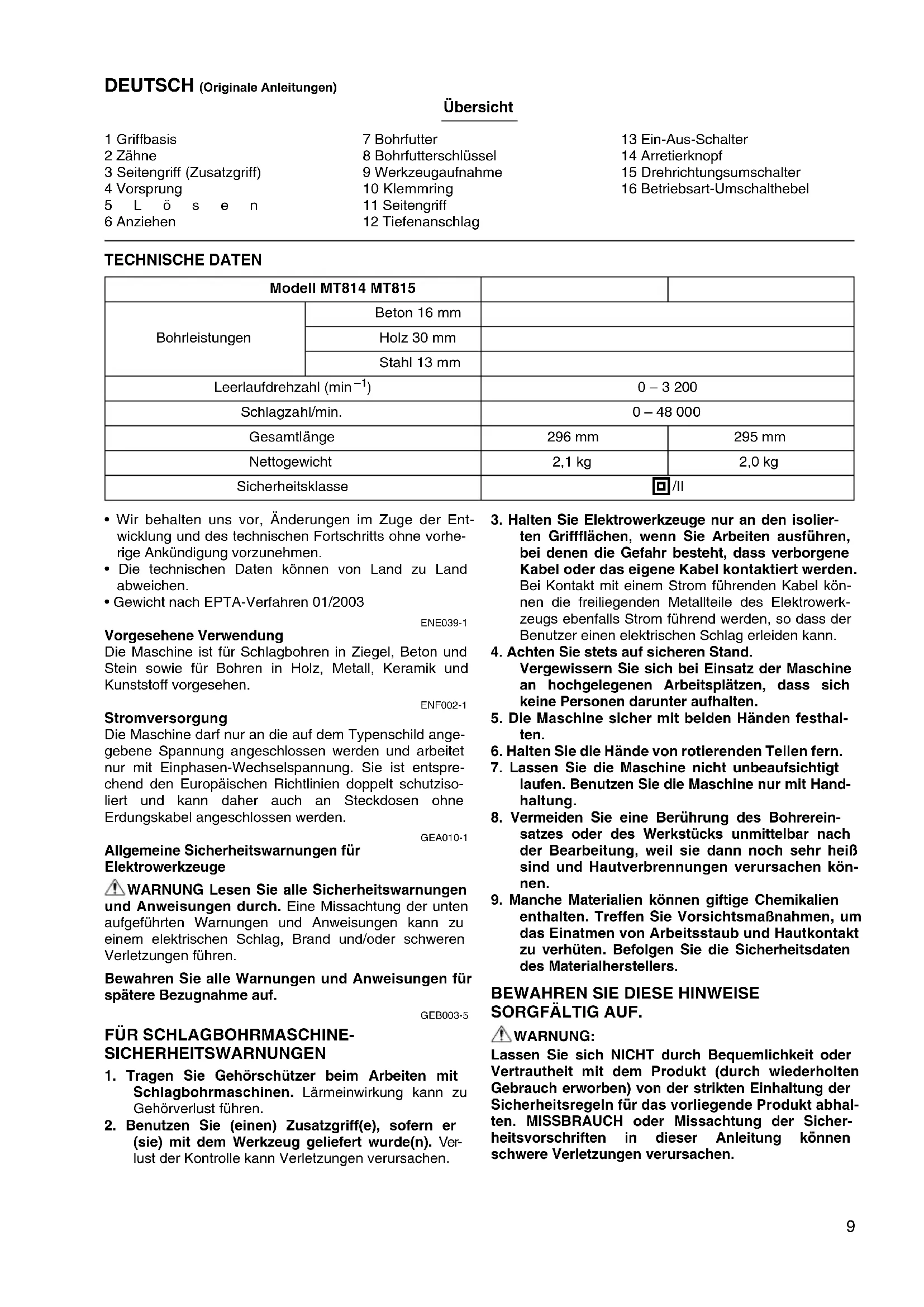 | Wartung | Regelm e4 dfig die Kohleb fcrsten pr fcfen und das Bohrfutter reinigen. |