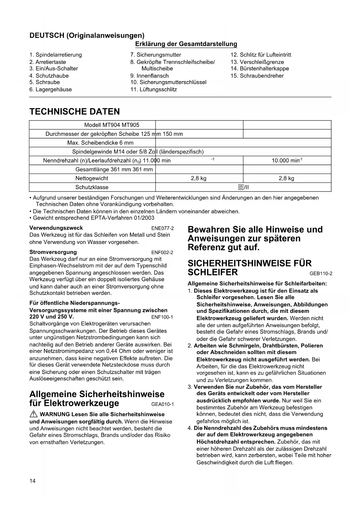 Laden Sie die Anleitung für Ihr Winkelschleifer kostenlos im PDF-Format! Finden Sie Ihr Handbuch MT904 - Maktec und nehmen Sie Ihr elektronisches Gerät wieder in die Hand. Auf dieser Seite sind alle Dokumente veröffentlicht, die für die Verwendung Ihres Geräts notwendig sind. MT904 von der Marke Maktec.