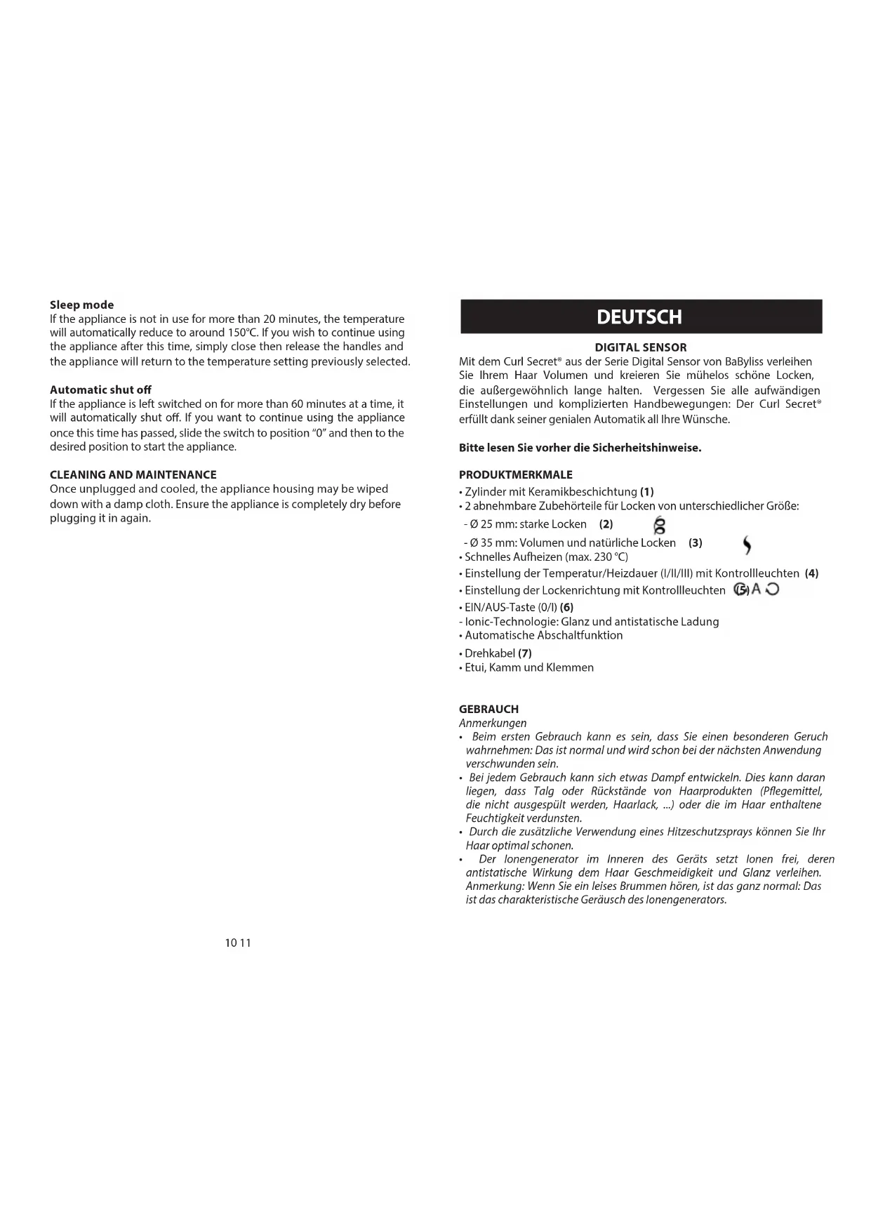 - After use, switch o and unplug the appliance. Allow to cool before storing. Protection system The appliance is tted with a protection system. If hair becomes tangled, the appliance emits an audible signal, it blocks, and stops heating. If this occurs, release the handles, ensuring that the appliance and section of hair are correctly positioned, then simply re-close the handles to deactivate the security system and re-start the appliance. 17_C1500E_IB.indd 8-9 8/29/17 8:44 AM10 11 DIGITAL SENSOR Mit dem Curl Secret® aus der Serie Digital Sensor von BaByliss verleihen Sie Ihrem Haar Volumen und kreieren Sie mühelos schöne Locken, die außergewöhnlich lange halten. Vergessen Sie alle aufwändigen Einstellungen und komplizierten Handbewegungen: Der Curl Secret® erfüllt dank seiner genialen Automatik all Ihre Wünsche. Bitte lesen Sie vorher die Sicherheitshinweise. PRODUKTMERKMALE
