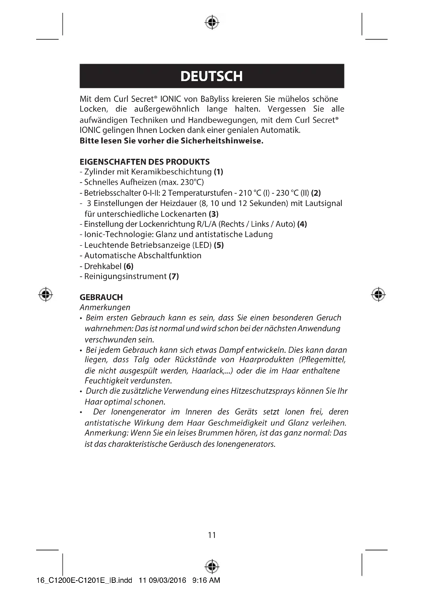 - The cleaning tool can be reused many times. Simply remove the felt pad, rinse it in warm soapy water and leave to dry before reusing. Once unplugged and cooled, the appliance housing may be wiped with a damp cloth. Ensure the appliance is completely dry before plugging it in again. 16_C1200E-C1201E_IB.indd 10 09/03/2016 9:16 AM11 Mit dem Curl Secret® IONIC von BaByliss kreieren Sie mühelos schöne Locken, die außergewöhnlich lange halten. Vergessen Sie alle aufwändigen Techniken und Handbewegungen, mit dem Curl Secret® IONIC gelingen Ihnen Locken dank einer genialen Automatik. Bitte lesen Sie vorher die Sicherheitshinweise.