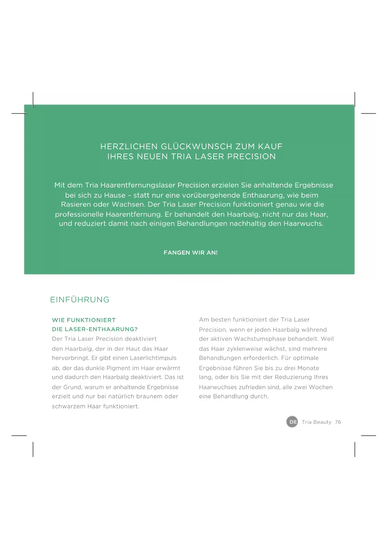 Mit dem Tria Haarentfernungslaser Precision erzielen Sie anhaltende Ergebnisse bei sich zu Hause – statt nur eine vorübergehende Enthaarung, wie beim Rasieren oder Wachsen. Der Tria Laser Precision funktioniert genau wie die professionelle Haarentfernung. Er behandelt den Haarbalg, nicht nur das Haar, und reduziert damit nach einigen Behandlungen nachhaltig den Haarwuchs. FANGEN WIR AN! WIE FUNKTIONIERT DIE LASER-ENTHAARUNG? Der Tria Laser Precision deaktiviert den Haarbalg, der in der Haut das Haar hervorbringt. Er gibt einen Laserlichtimpuls ab, der das dunkle Pigment im Haar erwärmt und dadurch den Haarbalg deaktiviert. Das ist der Grund, warum er anhaltende Ergebnisse erzielt und nur bei natürlich braunem oder schwarzem Haar funktioniert. Am besten funktioniert der Tria Laser Precision, wenn er jeden Haarbalg während der aktiven Wachstumsphase behandelt. Weil das Haar zyklenweise wächst, sind mehrere Behandlungen erforderlich. Für optimale Ergebnisse führen Sie bis zu drei Monate lang, oder bis Sie mit der Reduzierung Ihres Haarwuchses zufrieden sind, alle zwei Wochen eine Behandlung durch. EINFÜHRUNG77 MACHEN SIE SICH MIT DEM TRIA LASER PRECISION VERTRAUT