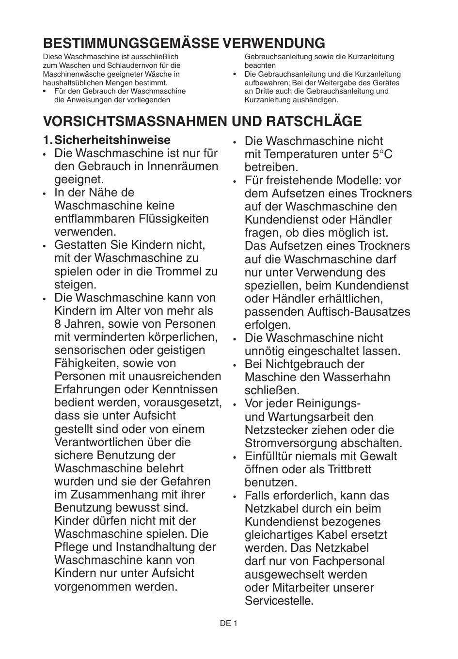1. Mesures de sécurité • Le lave-linge doit être installé dans une pièce, jamais à l’extérieur. • Ne stockez pas de produits inflammables à proximité du lavelinge. • Pour éviter qu’ils ne jouent avec l’appareil, les enfants ne doivent pas être laissés sans surveillance à proximité du lavelinge. • Le lave-linge peut être utiliser par les enfants de plus de 8 ans, ainsi que les personnes aux capacités physiques, sensorielles ou mentales réduites, ainsi que les personnes pourvues de connaissances insuffisantes sous réserve que ces dernières sont sous surveillance ou instruites par une personnes responsable sur l´utilisation sûre de la machine qu´elles aient compris les dangers potentiels découlant de l´utilisation de cette dernière. Les enfants ne doivent pas jouer avec la machine à laver. La maintenance et l´entretien de la machine à laver ne doivent être faits par les enfants sans surveillance • N’utilisez pas le lave-linge par température inférieure à 5 °C. • Pour les modèles pose-libre: si vous souhaitez installer un