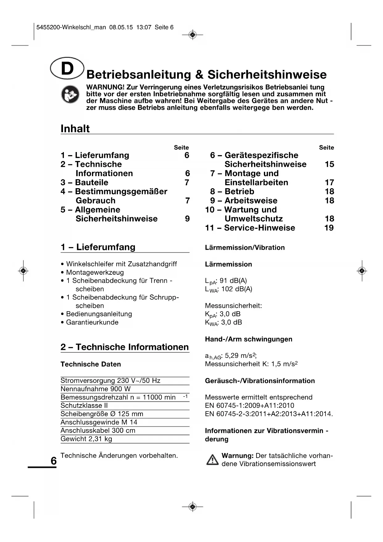 | 1 – Lieferumfang | 6 | 6 – Gerätespezifische Sicherheitshinweise | 15 |