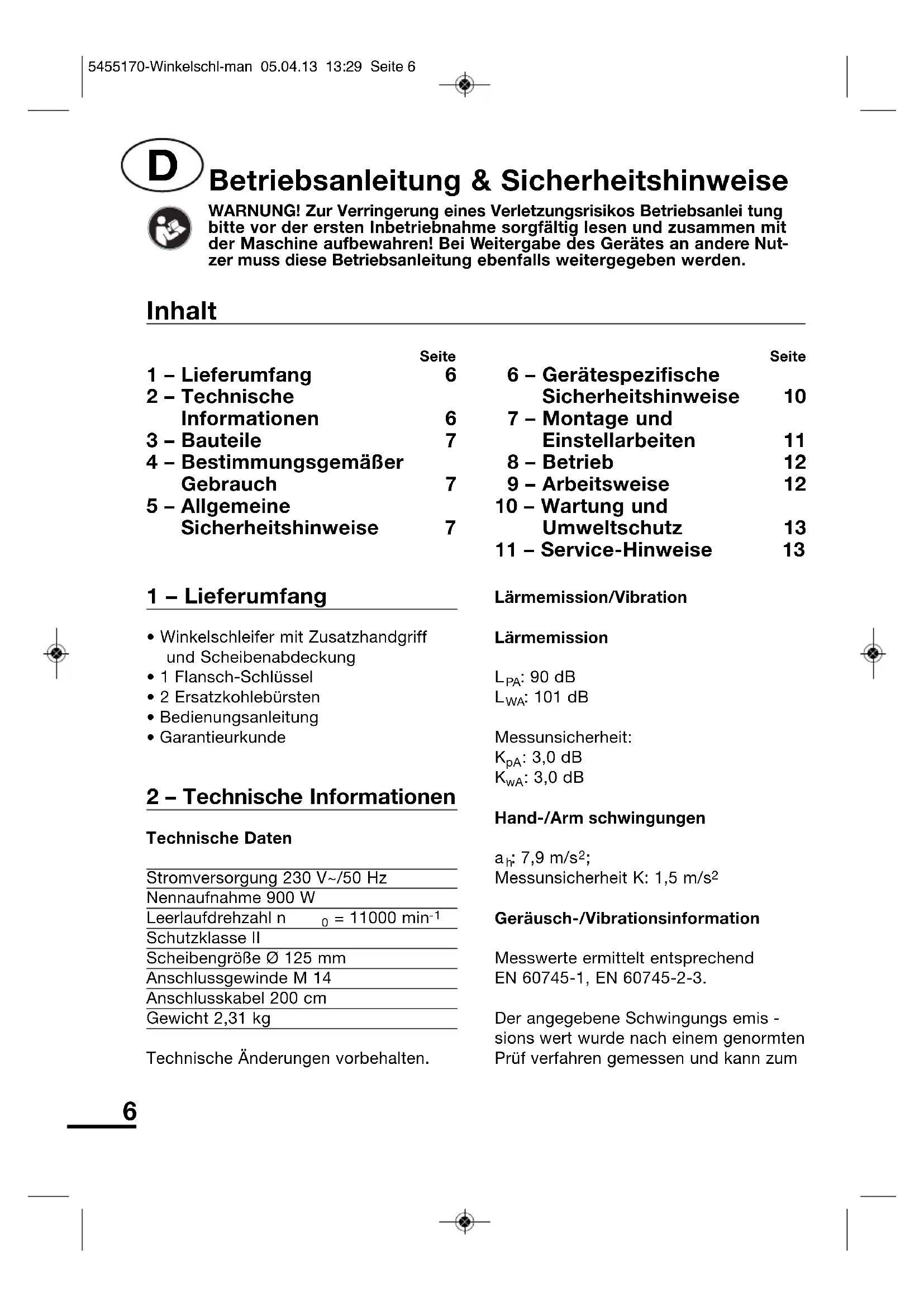 | 5 – Allgemeine Sicherheitshinweise | 7 | 10 – Wartung und Umweltschutz | 13 |