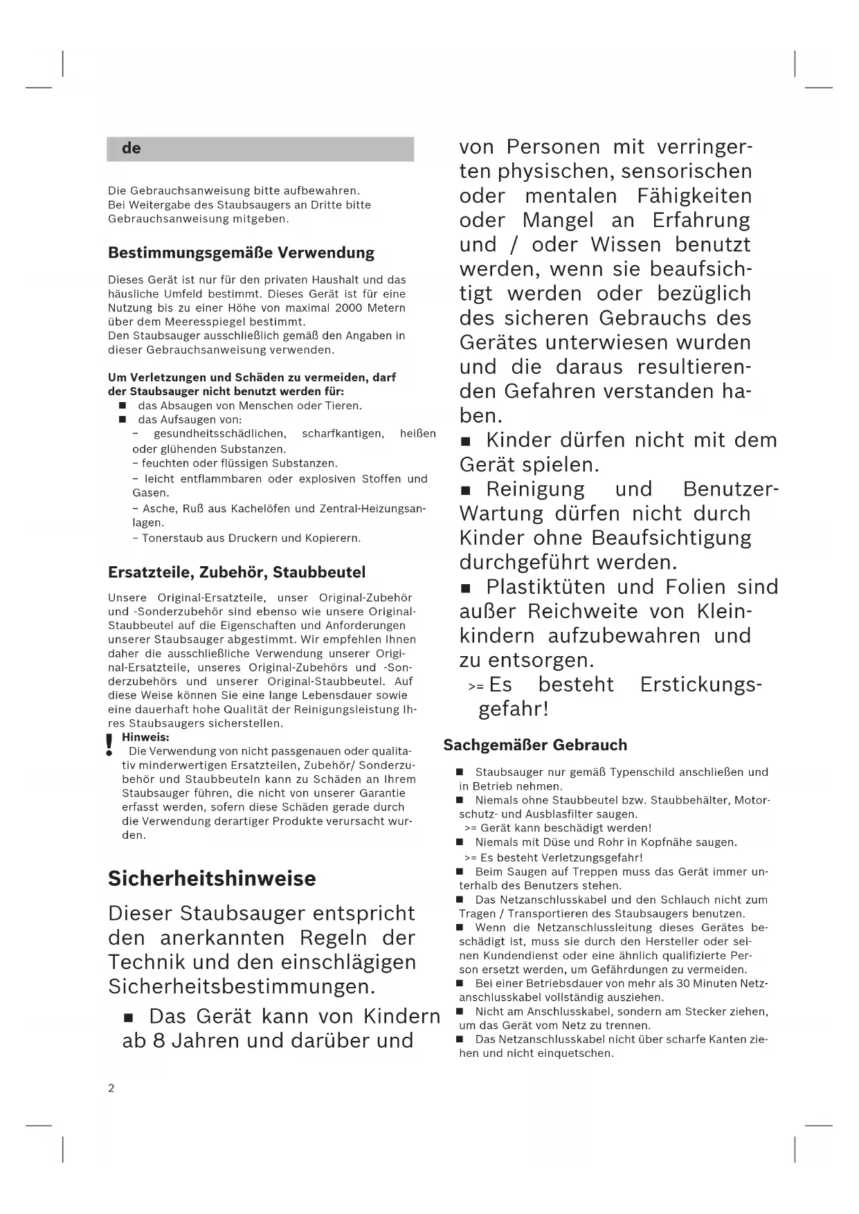 Die Gebrauchsanweisung bitte aufbewahren. Bei Weitergabe des Staubsaugers an Dritte bitte Gebrauchsanweisung mitgeben. Bestimmungsgemäße Verwendung Dieses Gerät ist nur für den privaten Haushalt und das häusliche Umfeld bestimmt. Dieses Gerät ist für eine Nutzung bis zu einer Höhe von maximal 2000 Metern über dem Meeresspiegel bestimmt. Den Staubsauger ausschließlich gemäß den Angaben in dieser Gebrauchsanweisung verwenden. Um Verletzungen und Schäden zu vermeiden, darf der Staubsauger nicht benutzt werden für: das Absaugen von Menschen oder Tieren. das Aufsaugen von: − gesundheitsschädlichen, scharfkantigen, heißen oder glühenden Substanzen. − feuchten oder flüssigen Substanzen. − leicht entflammbaren oder explosiven Stoffen und Gasen. − Asche, Ruß aus Kachelöfen und Zentral-Heizungsan- lagen. − Tonerstaub aus Druckern und Kopierern. Ersatzteile, Zubehör, Staubbeutel Unsere Original-Ersatzteile, unser Original-Zubehör und -Sonderzubehör sind ebenso wie unsere Original- Staubbeutel auf die Eigenschaften und Anforderungen unserer Staubsauger abgestimmt. Wir empfehlen Ihnen daher die ausschließliche Verwendung unserer Origi- nal-Ersatzteile, unseres Original-Zubehörs und -Son- derzubehörs und unserer Original-Staubbeutel. Auf diese Weise können Sie eine lange Lebensdauer sowie eine dauerhaft hohe Qualität der Reinigungsleistung Ih- res Staubsaugers sicherstellen.