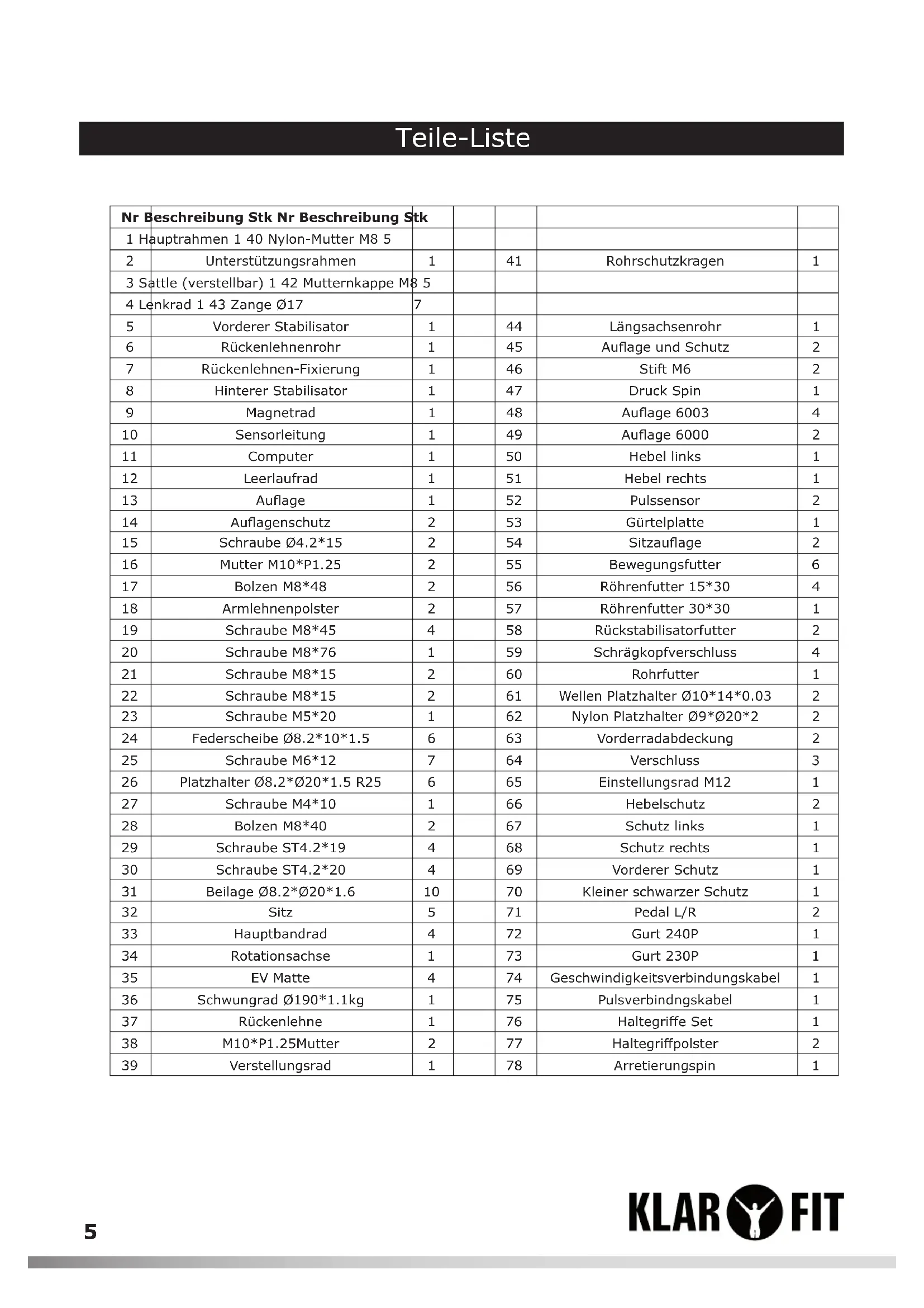 | 7 | Rückenlehen-Fixierung | 1 | 46 | Stift M6 | |
