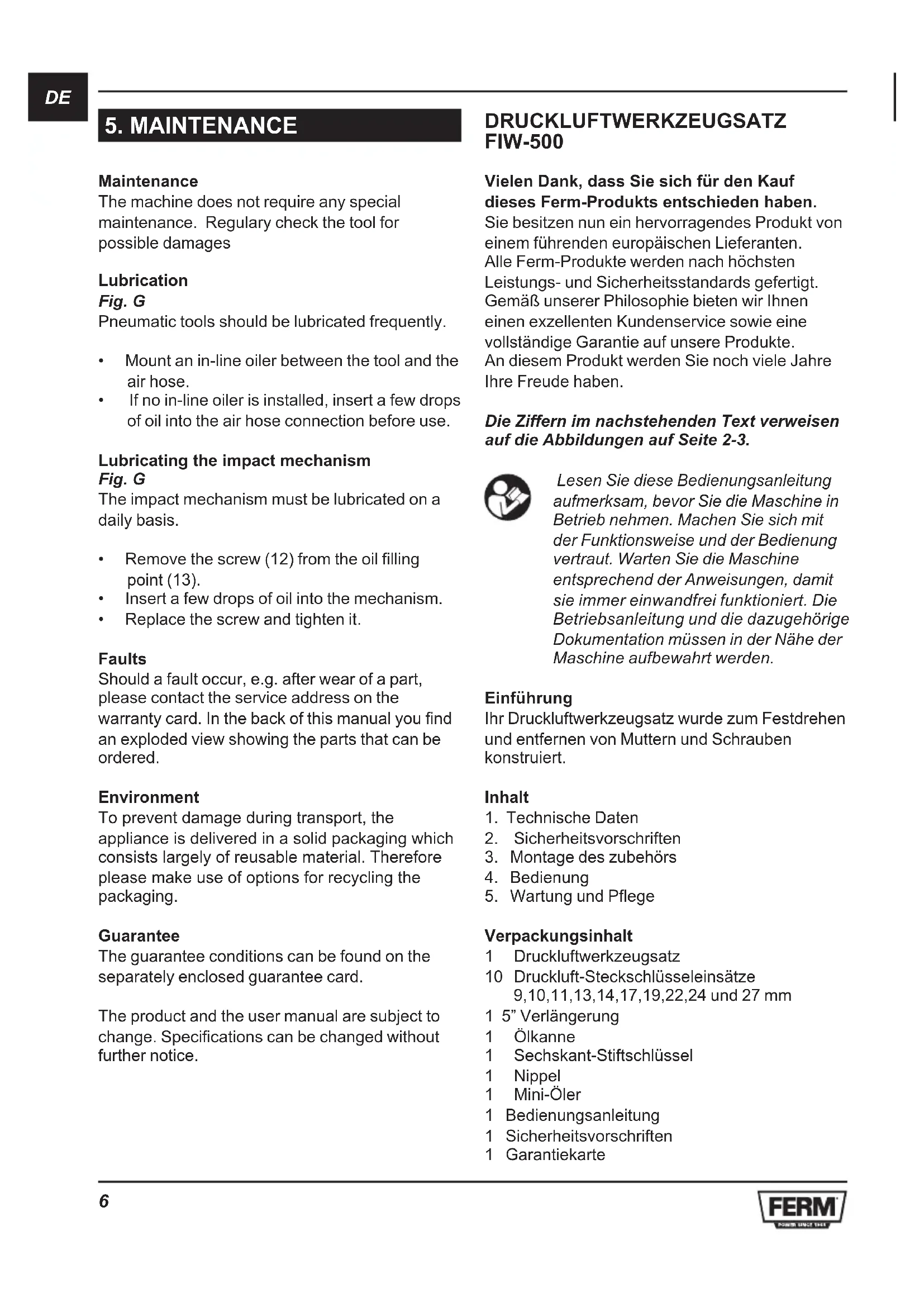 - Replace the screw and tighten it. Faults Should a fault occur, e.g. after wear of a part, please contact the service address on the warranty card. In the back of this manual you find an exploded view showing the parts that can be ordered. Environment To prevent damage during transport, the appliance is delivered in a solid packaging which consists largely of reusable material. Therefore please make use of options for recycling the packaging. Guarantee The guarantee conditions can be found on the separately enclosed guarantee card. The product and the user manual are subject to change. Specifications can be changed without further notice. DRUCKLUFTWERKZEUGSATZ FIW-500 Vielen Dank, dass Sie sich für den Kauf dieses Ferm-Produkts entschieden haben. Sie besitzen nun ein hervorragendes Produkt von einem führenden europäischen Lieferanten. Alle Ferm-Produkte werden nach höchsten Leistungs- und Sicherheitsstandards gefertigt. Gemäß unserer Philosophie bieten wir Ihnen einen exzellenten Kundenservice sowie eine vollständige Garantie auf unsere Produkte. An diesem Produkt werden Sie noch viele Jahre Ihre Freude haben. Die Ziffern im nachstehenden Text verweisen auf die Abbildungen auf Seite 2-3. Lesen Sie diese Bedienungsanleitung aufmerksam, bevor Sie die Maschine in Betrieb nehmen. Machen Sie sich mit der Funktionsweise und der Bedienung vertraut. Warten Sie die Maschine entsprechend der Anweisungen, damit sie immer einwandfrei funktioniert. Die Betriebsanleitung und die dazugehörige Dokumentation müssen in der Nähe der Maschine aufbewahrt werden. Einführung Ihr Druckluftwerkzeugsatz wurde zum Festdrehen und entfernen von Muttern und Schrauben konstruiert. Inhalt