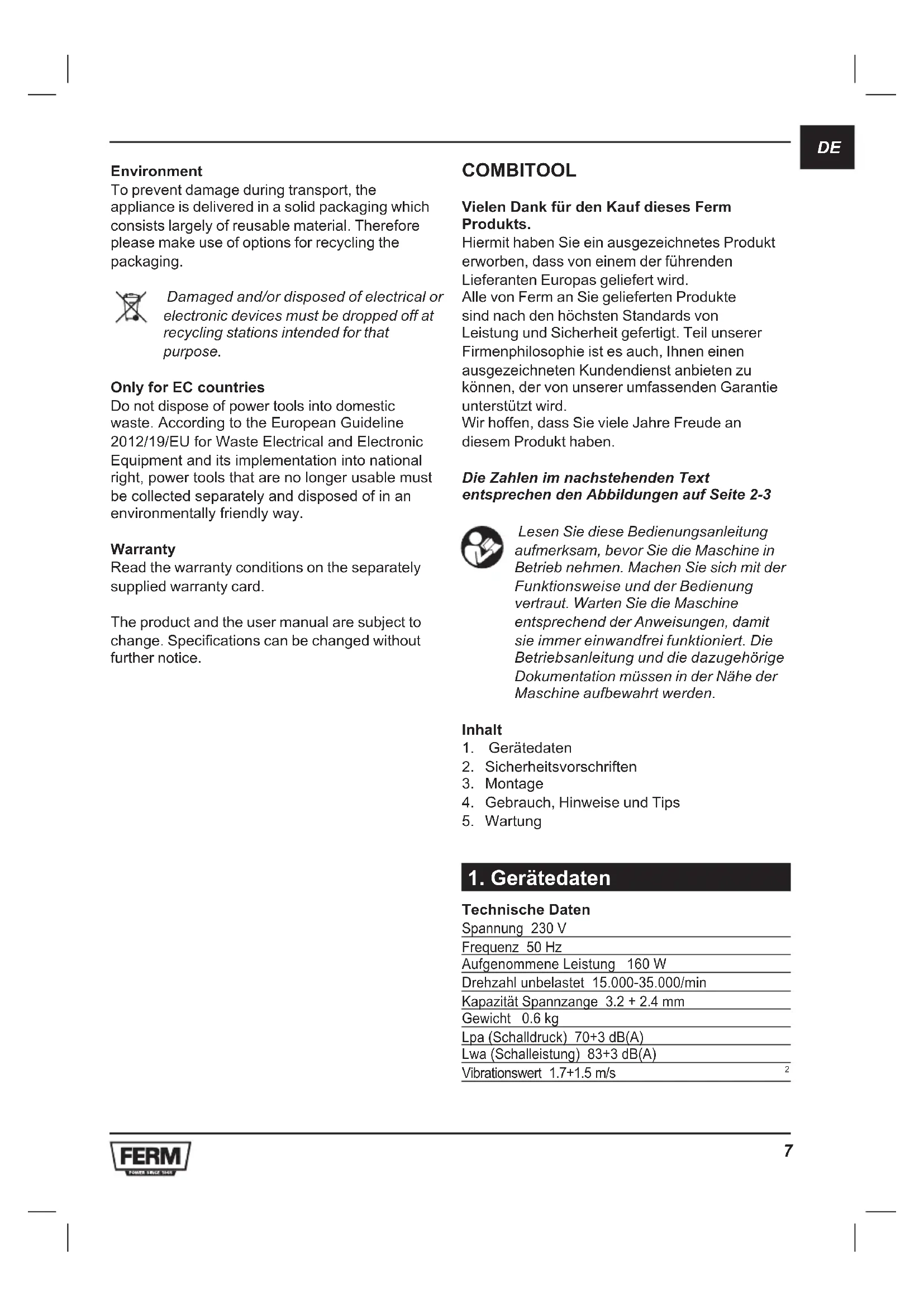 Environment To prevent damage during transport, the appliance is delivered in a solid packaging which consists largely of reusable material. Therefore please make use of options for recycling the packaging. Damaged and/or disposed of electrical or electronic devices must be dropped off at recycling stations intended for that purpose. Only for EC countries Do not dispose of power tools into domestic waste. According to the European Guideline 2012/19/EU for Waste Electrical and Electronic Equipment and its implementation into national right, power tools that are no longer usable must be collected separately and disposed of in an environmentally friendly way. Warranty Read the warranty conditions on the separately supplied warranty card. The product and the user manual are subject to change. Specifications can be changed without further notice. COMBITOOL Vielen Dank für den Kauf dieses Ferm Produkts. Hiermit haben Sie ein ausgezeichnetes Produkt erworben, dass von einem der führenden Lieferanten Europas geliefert wird. Alle von Ferm an Sie gelieferten Produkte sind nach den höchsten Standards von Leistung und Sicherheit gefertigt. Teil unserer Firmenphilosophie ist es auch, Ihnen einen ausgezeichneten Kundendienst anbieten zu können, der von unserer umfassenden Garantie unterstützt wird. Wir hoffen, dass Sie viele Jahre Freude an diesem Produkt haben. Die Zahlen im nachstehenden Text entsprechen den Abbildungen auf Seite 2-3 Lesen Sie diese Bedienungsanleitung aufmerksam, bevor Sie die Maschine in Betrieb nehmen. Machen Sie sich mit der Funktionsweise und der Bedienung vertraut. Warten Sie die Maschine entsprechend der Anweisungen, damit sie immer einwandfrei funktioniert. Die Betriebsanleitung und die dazugehörige Dokumentation müssen in der Nähe der Maschine aufbewahrt werden. Inhalt