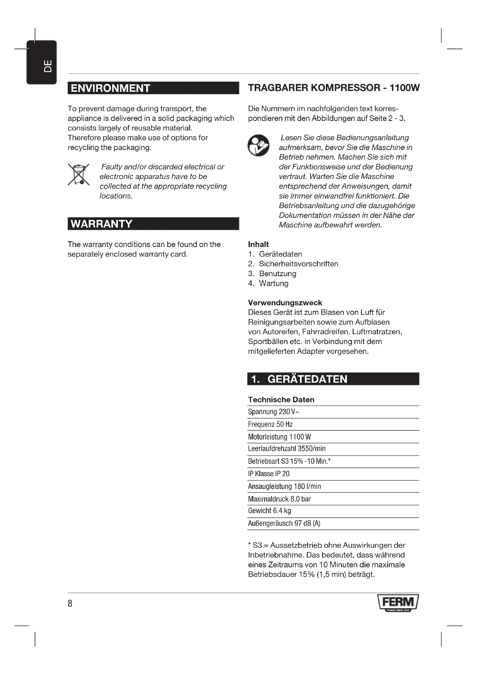 Technische Daten Spannung 230 V~ Frequenz 50 Hz Motorleistung 1100 W Leerlaufdrehzahl 3550/min Betriebsart S3 15% -10 Min.* IP Klasse IP 20 Ansaugleistung 180 l/min Maximaldruck 8.0 bar Gewicht 6.4 kg Außengeräusch 97 dB (A)