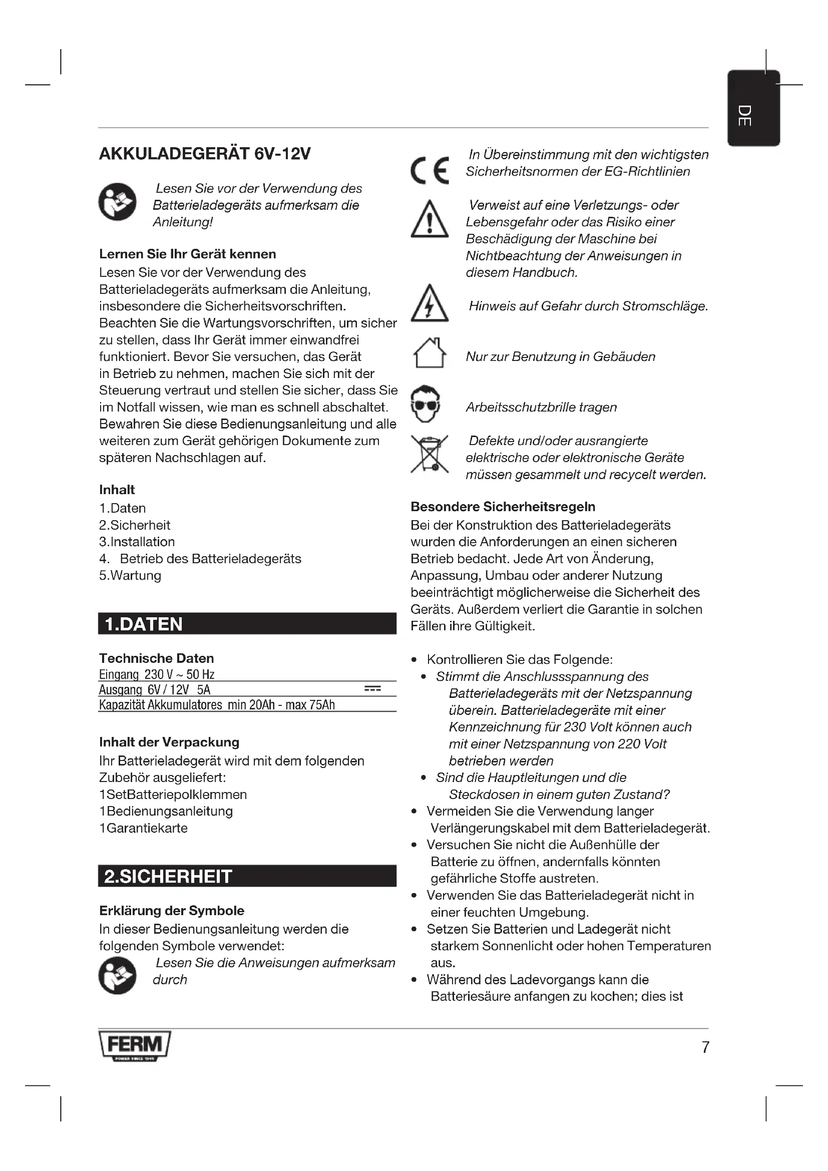Technische Daten Eingang 230 V ~ 50 Hz Ausgang 6V / 12V 5A Kapazität Akkumulatores min 20Ah - max 75Ah Inhalt der Verpackung Ihr Batterieladegerät wird mit dem folgenden Zubehör ausgeliefert: 1 Set Batteriepolklemmen 1 Bedienungsanleitung 1 Garantiekarte