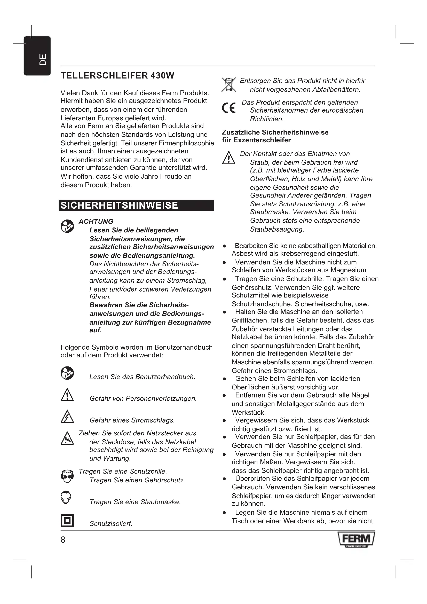 TELLERSCHLEIFER 430W VielenDankfürdenKaufdiesesFermProdukts. HiermithabenSieeinausgezeichnetesProdukt erworben,dassvoneinemderführenden Lieferanten Europas geliefert wird. Alle von Ferm an Sie gelieferten Produkte sind nach den höchsten Standards von Leistung und Sicherheit gefertigt. Teil unserer Firmenphilosophie istesauch,Ihneneinenausgezeichneten Kundendienstanbietenzukönnen,dervon unsererumfassendenGarantieunterstütztwird. Wirhoen,dassSievieleJahreFreudean diesem Produkt haben. SICHERHEITSHINWEISE