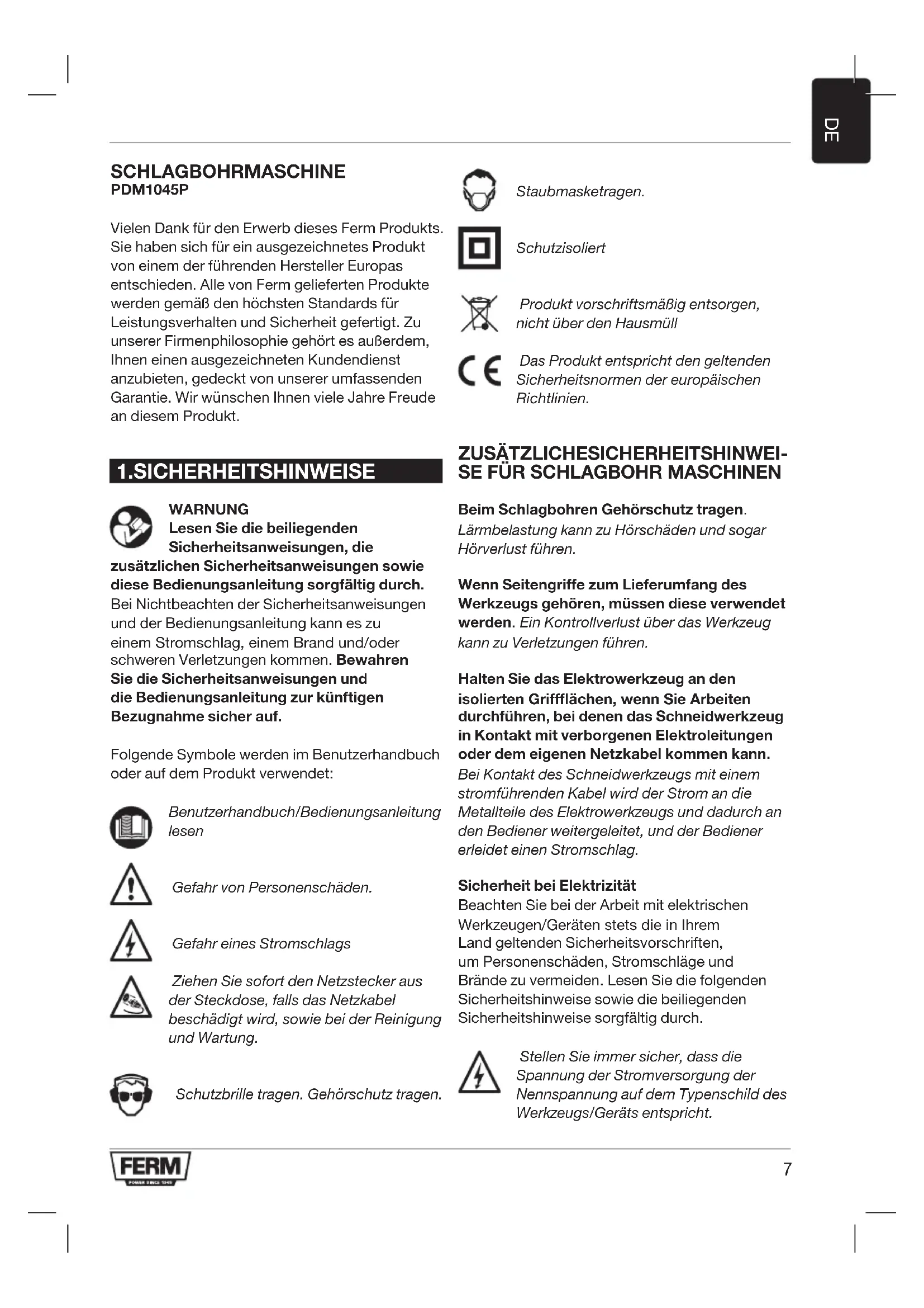 SCHLAGBOHRMASCHINE PDM1045P Vielen Dank für den Erwerb dieses Ferm Produkts. Sie haben sich für ein ausgezeichnetes Produkt von einem der führenden Hersteller Europas entschieden. Alle von Ferm gelieferten Produkte werden gemäß den höchsten Standards für Leistungsverhalten und Sicherheit gefertigt. Zu unserer Firmenphilosophie gehört es außerdem, Ihnen einen ausgezeichneten Kundendienst anzubieten, gedeckt von unserer umfassenden Garantie. Wir wünschen Ihnen viele Jahre Freude an diesem Produkt.