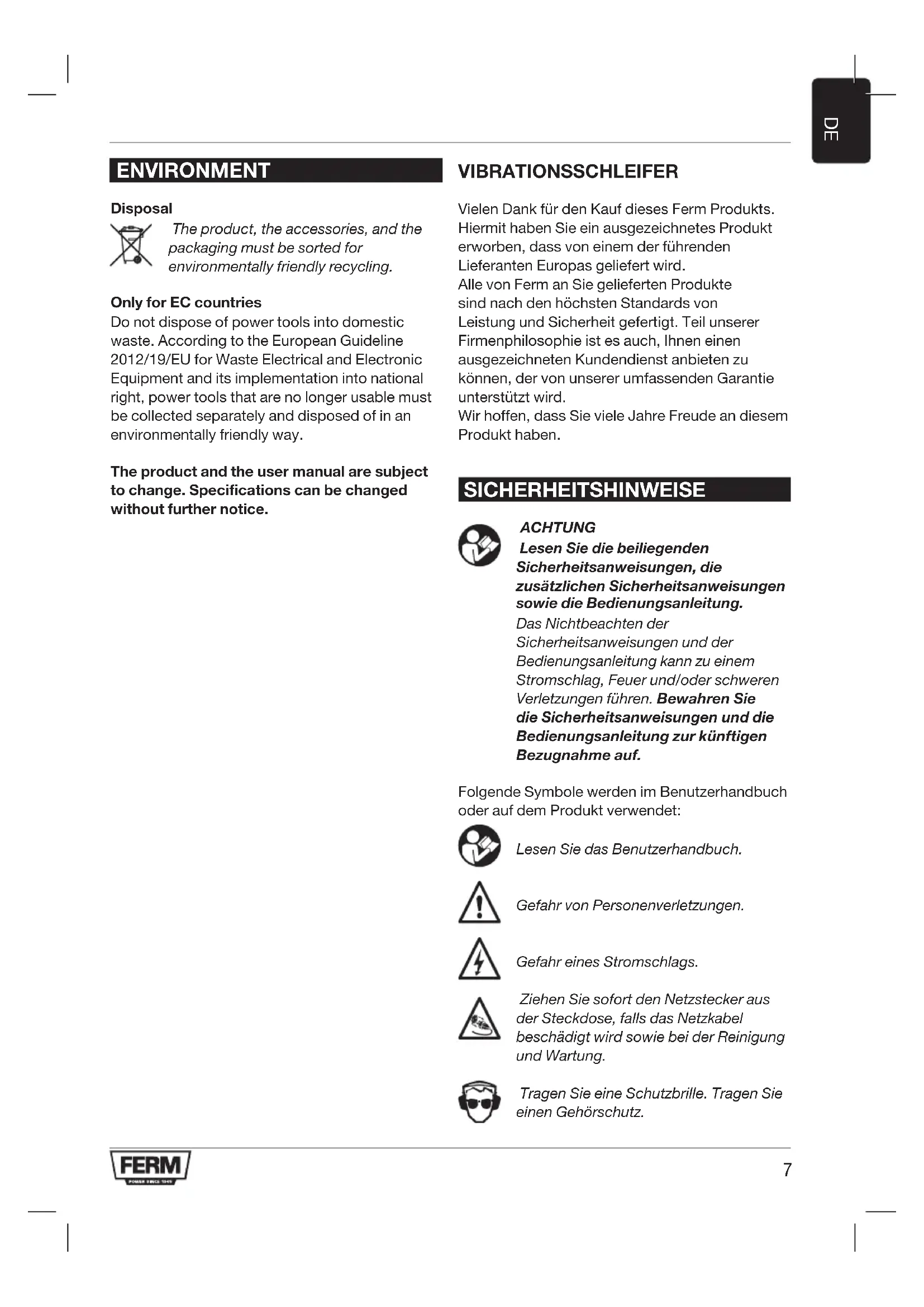 ENVIRONMENT Disposal The product, the accessories, and the packaging must be sorted for environmentally friendly recycling. Only for EC countries Do not dispose of power tools into domestic waste. According to the European Guideline 2012/19/EU for Waste Electrical and Electronic Equipment and its implementation into national right, power tools that are no longer usable must be collected separately and disposed of in an environmentally friendly way. The product and the user manual are subject to change. Specifications can be changed without further notice. VIBRATIONSSCHLEIFER Vielen Dank für den Kauf dieses Ferm Produkts. Hiermit haben Sie ein ausgezeichnetes Produkt erworben, dass von einem der führenden Lieferanten Europas geliefert wird. Alle von Ferm an Sie gelieferten Produkte sind nach den höchsten Standards von Leistung und Sicherheit gefertigt. Teil unserer Firmenphilosophie ist es auch, Ihnen einen ausgezeichneten Kundendienst anbieten zu können, der von unserer umfassenden Garantie unterstützt wird. Wir hoffen, dass Sie viele Jahre Freude an diesem Produkt haben. SICHERHEITSHINWEISE ACHTUNG Lesen Sie die beiliegenden Sicherheitsanweisungen, die zusätzlichen Sicherheitsanweisungen sowie die Bedienungsanleitung. Das Nichtbeachten der Sicherheitsanweisungen und der Bedienungsanleitung kann zu einem Stromschlag, Feuer und/oder schweren Verletzungen führen. Bewahren Sie die Sicherheitsanweisungen und die Bedienungsanleitung zur künftigen Bezugnahme auf. Folgende Symbole werden im Benutzerhandbuch oder auf dem Produkt verwendet: Lesen Sie das Benutzerhandbuch. Gefahr von Personenverletzungen. Gefahr eines Stromschlags. Ziehen Sie sofort den Netzstecker aus der Steckdose, falls das Netzkabel beschädigt wird sowie bei der Reinigung und Wartung. Tragen Sie eine Schutzbrille. Tragen Sie einen Gehörschutz.8