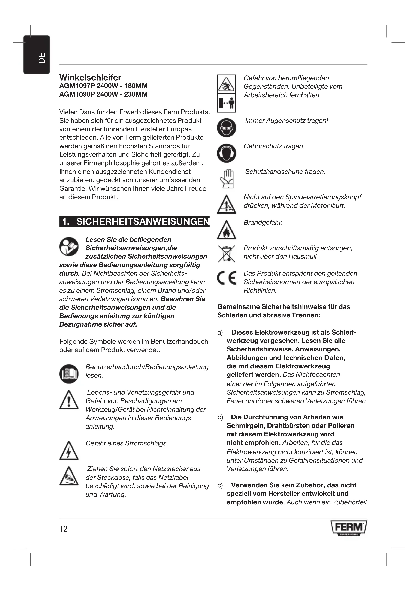 AGM1098P - Elektrowinkelschleifer Ferm - Kostenlose Bedienungsanleitung