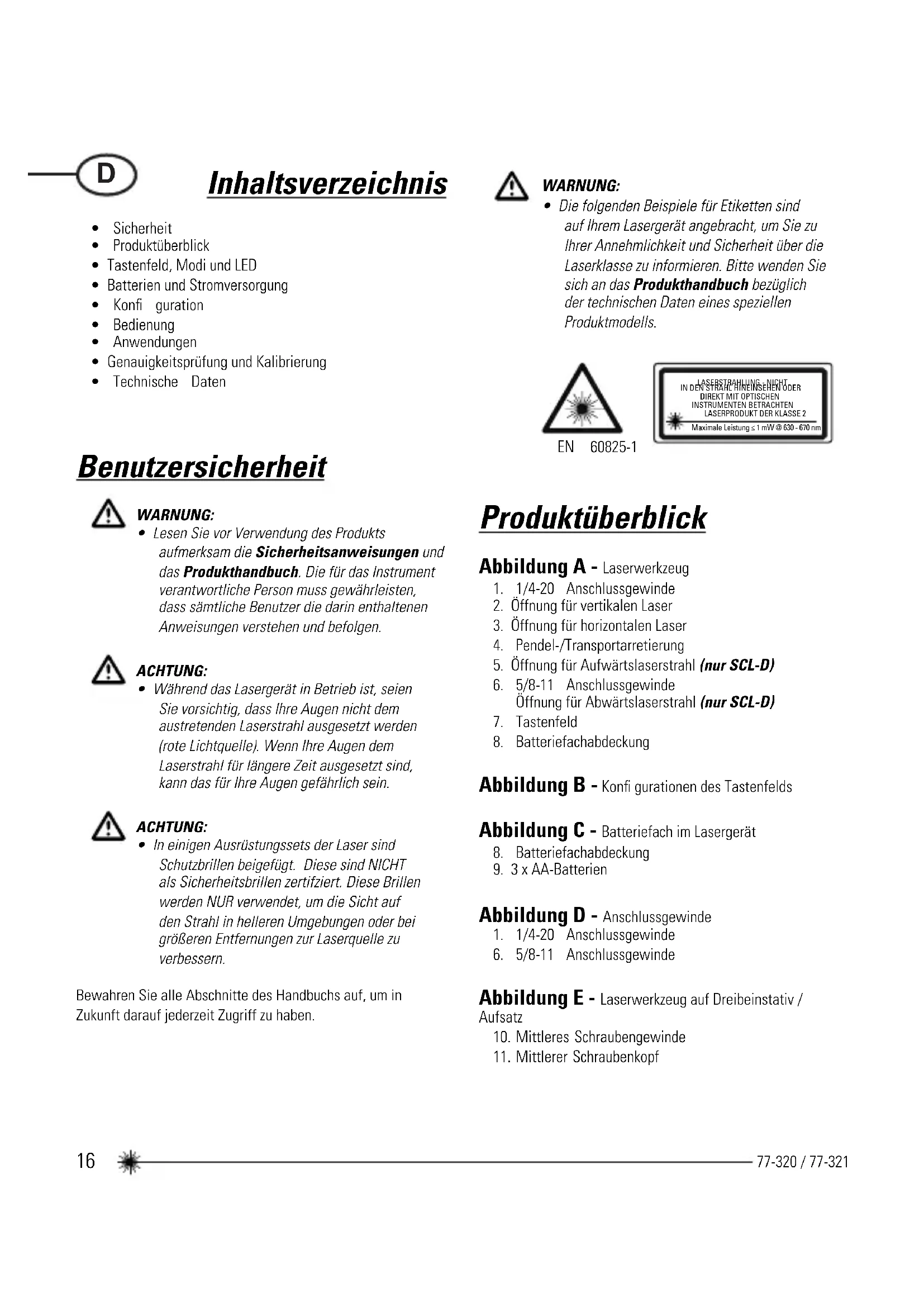 - 1,5 mm ≤ 2,0 mm (KORREKT, Gerät befi ndet sich innerhalb der Kalibrierungstoleranz)22 77-320 / 77-321 Technische Daten Lasergerät SCL SCL-D Nivellierungsgenauigkeit: ≤3 mm / 15m Horizontale / Vertikale Genauigkeit ≤3 mm / 15m Aufwärtsstrahlgenauigkeit: ≤3 mm / 15m Abwärtsstrahlgenauigkeit: ≤6 mm / 15m Kompensierungsbereich: Selbstnivellierung auf ± 4° Arbeitsentfernung: Linie: ≥10m ≥15m mit Laserdetektor: ≥25m ≥50 m Punkt ≥30m Laserklasse: Klasse 2 (EN60825-1) Laserwellenlänge: 635nm ± 5nm Betriebsdauer: ≥ 18 Stunden (Alkaline) ≥ 10 Stunden (Alkaline) Stromversorgung: 3 x AA-Batterien IP-Klasse: IP54 Betriebstemperaturbereich: -10°C bis +50°C Lagertemperaturbereich: -25°C bis +70°C23 77-320 / 77-321 Hinweise24 77-320 / 77-321 EN 60825-1