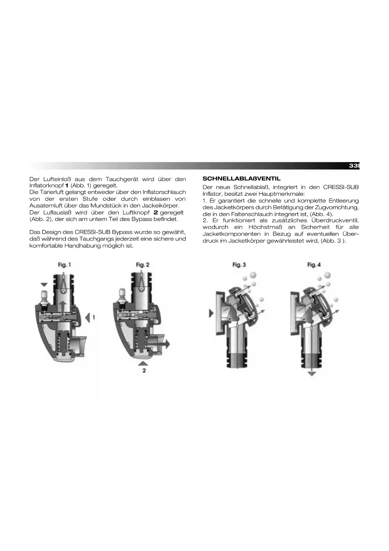 WERKSGARANTIE! Libretto 25/10/05 25-10-2005 12:53 Pagina 3132 Deutsch Libretto 25/10/05 25-10-2005 12:53 Pagina 3233Deutsch Der Lufteinloß aus dem Tauchgerät wird über den Inflatorknopf 1 (Abb. 1) geregelt. Die Tarierluft gelangt entweder über den Inflatorschlauch von der ersten Stufe oder durch einblasen von Ausatemluft über das Mundstück in den Jackeikörper. Der Luflauslaß wird über den Luftknopf 2 geregelt (Abb. 2), der sich am untern Teil des Bypass befindet. Das Design des CRESSI-SUB Bypass wurde so gewählt, daß während des Tauchgangs jederzeit eine sichere und komfortable Handhabung möglich ist. SCHNELLABLAßVENTIL Der neue Schnellablaß, integriert in den CRESSI-SUB Inflator, besitzt zwei Hauptmerkmale: