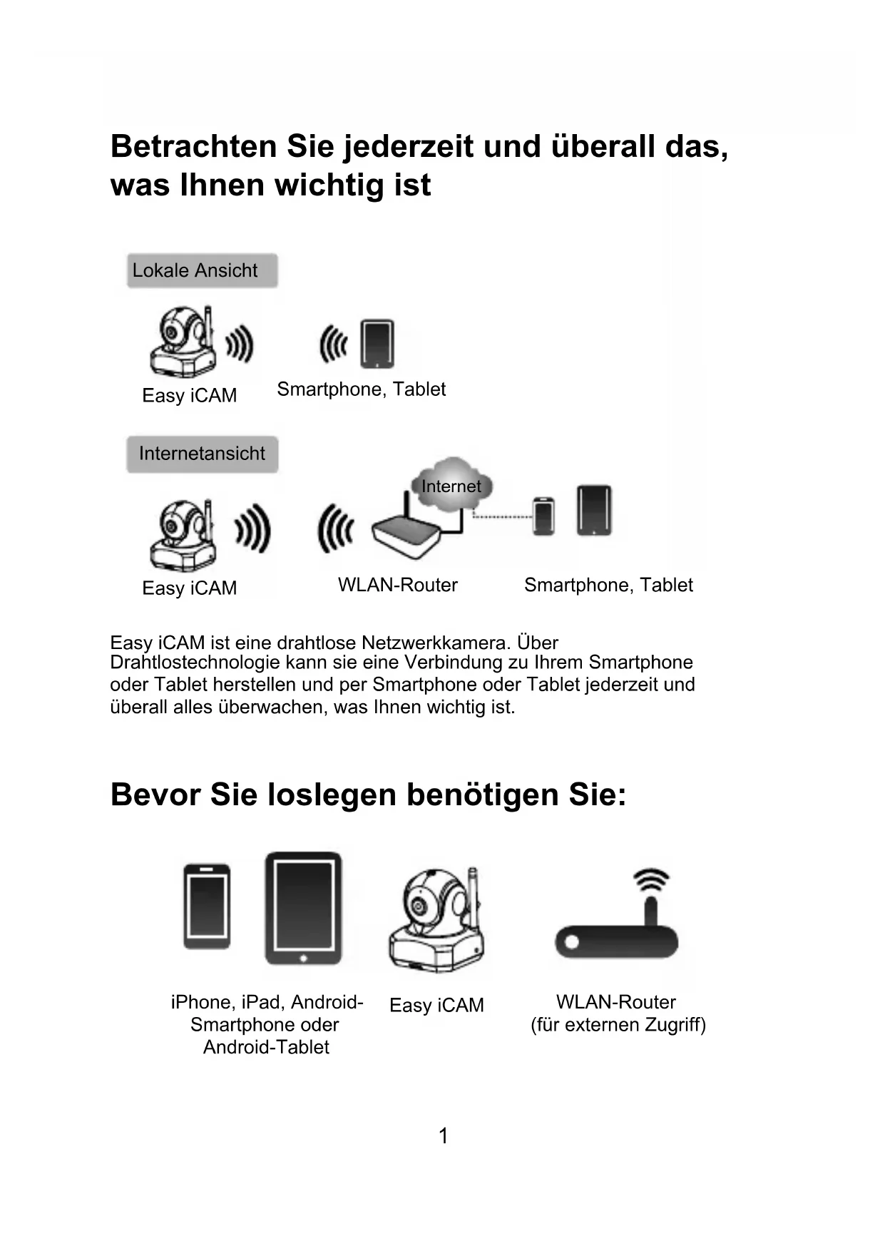 Easy-iCAM ist eine drahtlose Netzwerkkamera. Sie kann per Drahtlostechnologie direkt eine Verbindung mit Ihr Smartphone oder Tablet herstellen und Sie konnen Echtzeitvideo-Feeds an Ihr Smartphone oder Tablet im lokalen Ansichtsmodus betrachten. Im Internetansichtsmodus muss Ihr Smartphone oder Tablet über einen WLAN-Router oder ein mobiles 3G/4G-Netzwerk eine Verbindung zur Kamera herstellen; anschließend konnen Sie an Ihr Smartphone oder Tablet überall auf der Welt auf den Echtzeitstream mit Bild und Ton zugreifen.