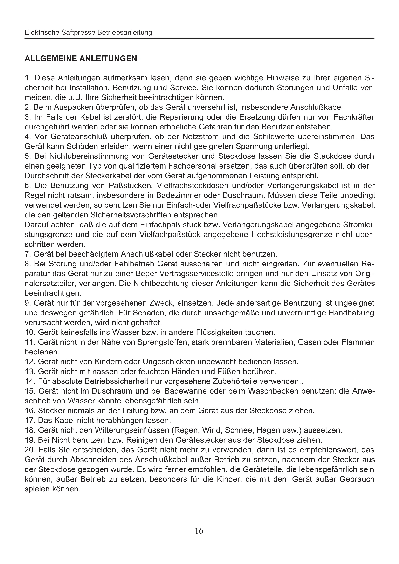 ELEKTRISCHE SAFTPRESSE - BETRIEBSANLEITUNG