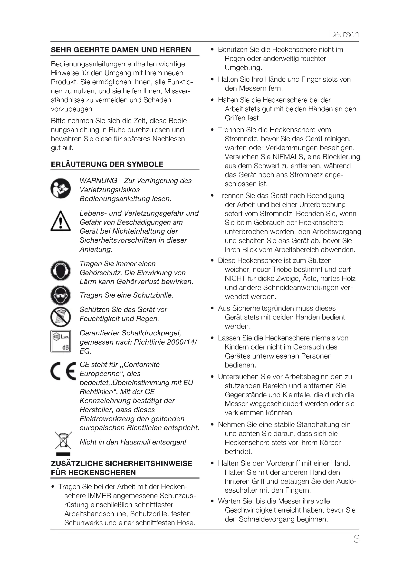 WARNING Falls das Gerät für andere als ausdrücklich in dieser Betriebsanleitung genannte Zwecke verwendet wird, können Schäden an der Heckenschere und/oder schwere Verletzungen des Bedieners verursachen.