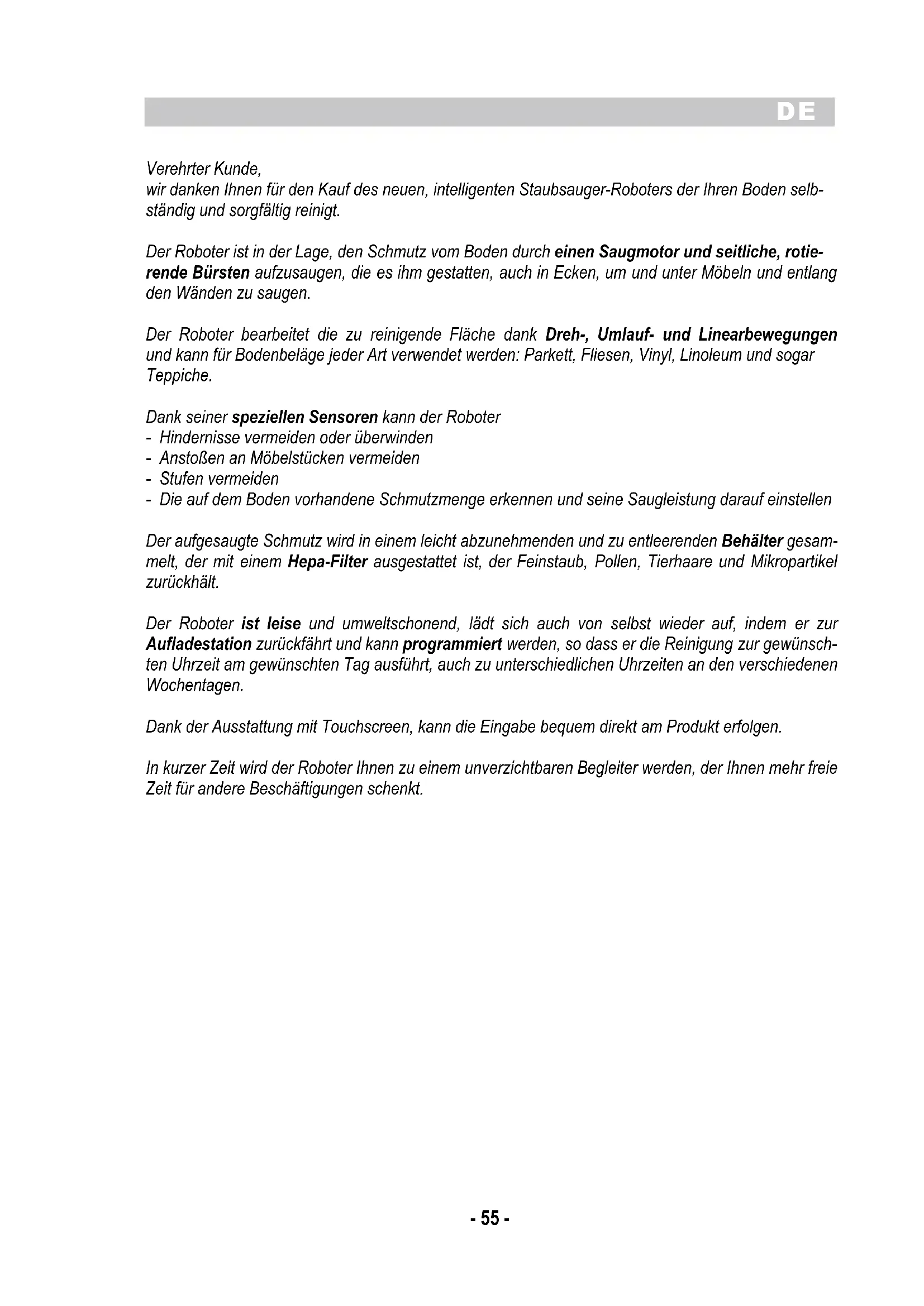 Verehrter Kunde, wir danken Ihnen für den Kauf des neuen, intelligenten Staubsauger-Roboters der Ihren Boden selb- ständig und sorgfältig reinigt. Der Roboter ist in der Lage, den Schmutz vom Boden durch einen Saugmotor und seitliche, rotie- rende Bürsten aufzusaugen, die es ihm gestatten, auch in Ecken, um und unter Möbeln und entlang den Wänden zu saugen. Der Roboter bearbeitet die zu reinigende Fläche dank Dreh-, Umlauf- und Linearbewegungen und kann für Bodenbeläge jeder Art verwendet werden: Parkett, Fliesen, Vinyl, Linoleum und sogar Teppiche. Dank seiner speziellen Sensoren kann der Roboter - Hindernisse vermeiden oder überwinden - Anstoßen an Möbelstücken vermeiden - Stufen vermeiden - Die auf dem Boden vorhandene Schmutzmenge erkennen und seine Saugleistung darauf einstellen Der aufgesaugte Schmutz wird in einem leicht abzunehmenden und zu entleerenden Behälter gesam- melt, der mit einem Hepa-Filter ausgestattet ist, der Feinstaub, Pollen, Tierhaare und Mikropartikel zurückhält. Der Roboter ist leise und umweltschonend, lädt sich auch von selbst wieder auf, indem er zur Aufladestation zurückfährt und kann programmiert werden, so dass er die Reinigung zur gewünsch- ten Uhrzeit am gewünschten Tag ausführt, auch zu unterschiedlichen Uhrzeiten an den verschiedenen Wochentagen. Dank der Ausstattung mit Touchscreen, kann die Eingabe bequem direkt am Produkt erfolgen. In kurzer Zeit wird der Roboter Ihnen zu einem unverzichtbaren Begleiter werden, der Ihnen mehr freie Zeit für andere Beschäftigungen schenkt.DE