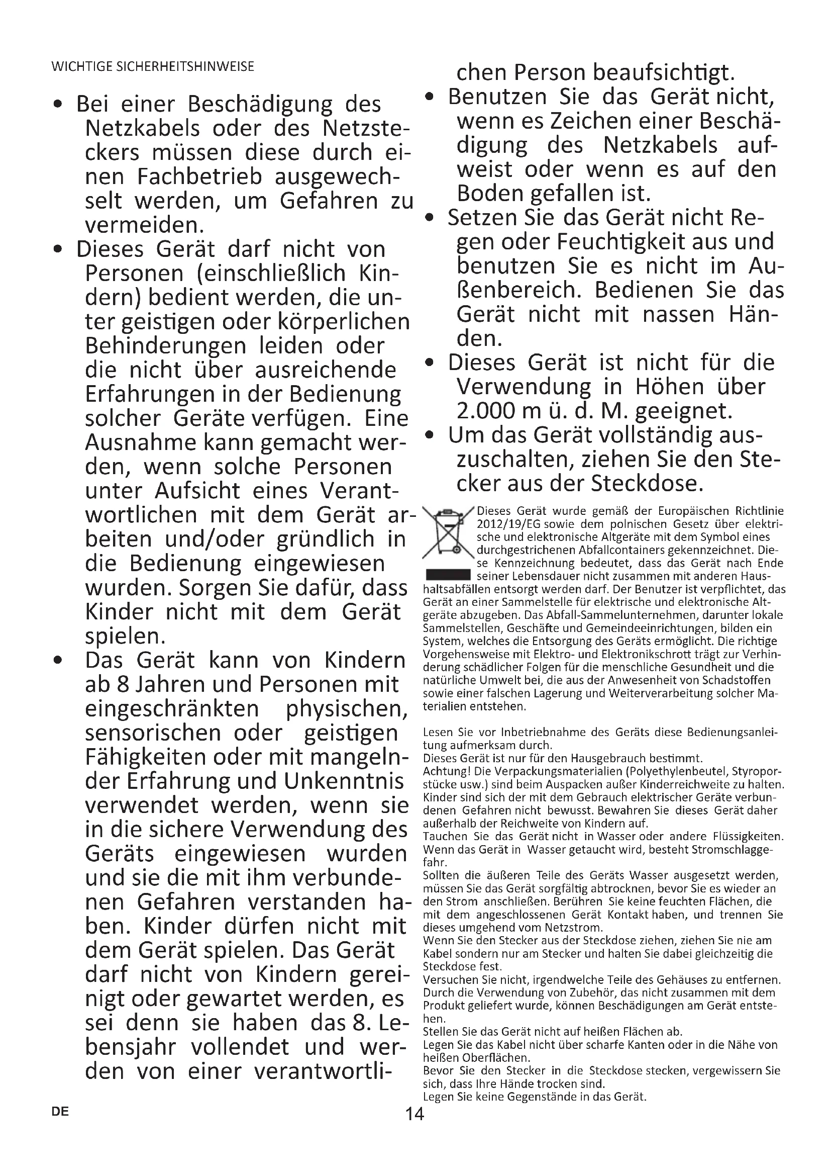 - Dieses Gerät ist nicht für die Verwendung in Höhen über