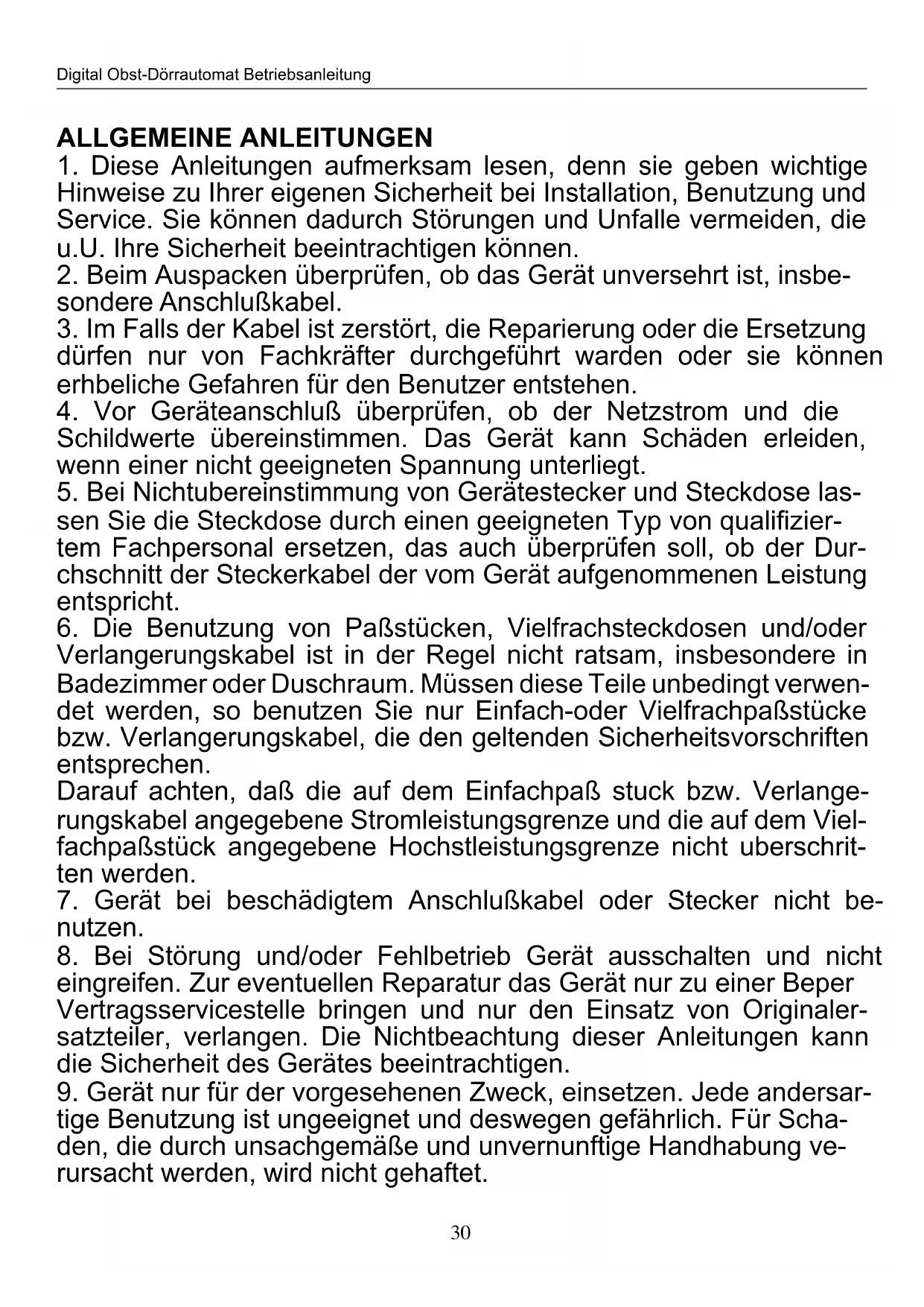 Beper Srl übernimmt keine Verantwortung für Schäden, die direkt oder indirekt Personen, Gegenstände und Haustieren betreffen könnten, als Folge der Nicht-Einhaltung aller in der Broschüre „Gebrauchsanweisungen und Warnungen“ enthaltenen Anweisungen in Bezug auf Installation, Bedienung und Wartung.