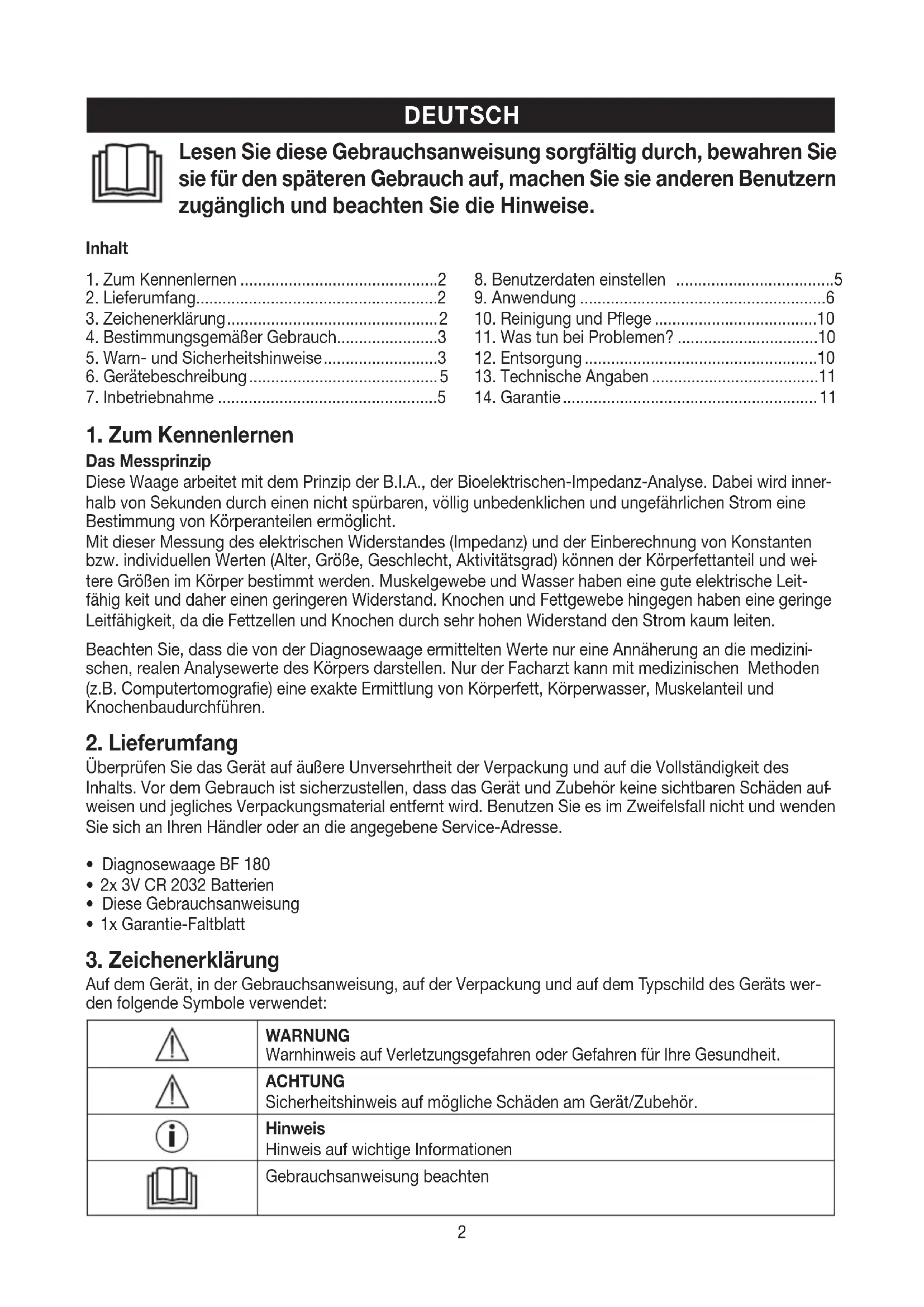 Auf dem Gerät, in der Gebrauchsanweisung, auf der Verpackung und auf dem Typschild des Geräts wer- den folgende Symbole verwendet: WARNUNG Warnhinweis auf Verletzungsgefahren oder Gefahren für Ihre Gesundheit. ACHTUNG Sicherheitshinweis auf mögliche Schäden am Gerät/Zubehör. Hinweis Hinweis auf wichtige Informationen Gebrauchsanweisung beachten Lesen Sie diese Gebrauchsanweisung sorgfältig durch, bewahren Sie sie für den späteren Gebrauch auf, machen Sie sie anderen Benutzern zugänglich und beachten Sie die Hinweise. Inhalt3 Entsorgung gemäß Elektro- und Elektronik-Altgeräte EG-Richtlinie WEEE (Waste Electrical and Electronic Equipment) Schadstoffhaltige Batterien nicht im Hausmüll entsorgen