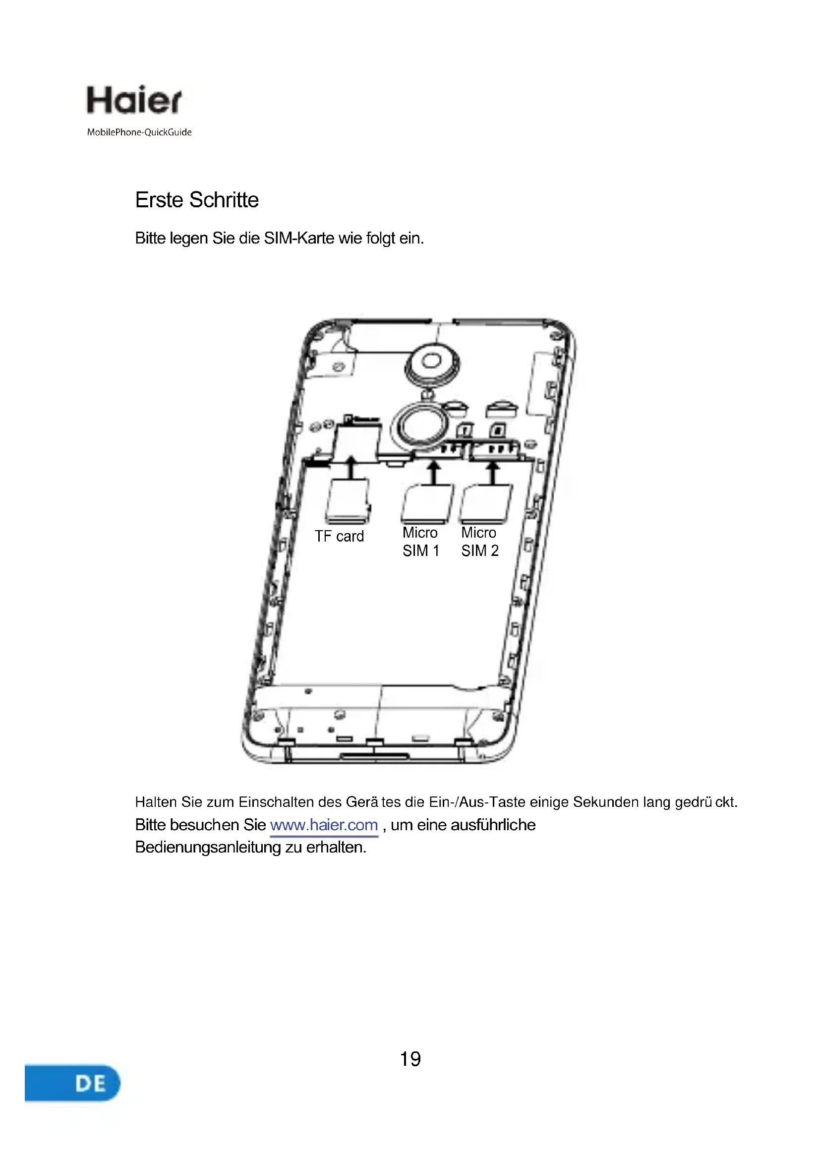 Bitte besuchen Sie www.haier.com , um eine ausführliche Bedienungsanleitung zu erhalten. Halten Sie zum Einschalten des Gerätes die Ein-/Aus-Taste einige Sekunden lang gedrückt. Bitte legen Sie die SIM-Karte wie folgt ein.Impressum Dieses Dokumentdarf weder ganz noch teilweise auf irgendeine Weise ohne die vorherige schriftliche Zustimmung von Haier vervielfältigt oder übertragen werden. ist eine Marke der Haier Europe Trading SRL. Haier behält sich das Recht vor, die Informationen in diesem Handbuch jederzeit zu ändern. Haftungsausschluss DIENSTE UND INHALTE DRITTER WERDEN IM «IST-ZUSTAND» ANGEBOTEN. HAIER ÜBERNIMMT KEINE GARANTIE FÜR DIE ANGEBOTENEN INHALTE UND DIENSTE, WEDER AUSDRÜCKLICH NOCH STILLSCHWEIGEND, FÜR WELCHE ZWECKE AUCH IMMER SOWIE KEINE GARANTIEN DER MARKTGÄNGIGKEIT UND DER EIGNUNG FÜR EINEN BESTIMMTEN ZWECK. HAIER GARANTIERT NICHT DIE RICHTIGKEIT,VALIDITÄT, LEGALITÄT ODER VOLLSTÄNDIGKEIT DER INHALTE ODER DIENSTE, DIE MIT DIESEM GERÄT ZUR VERFÜGUNG GESTELLT WERDEN. HAIER IST NICHT HAFTBAR FÜR FAHRLÄSSIGKEIT, WEDER VERTRAGLICH NOCH