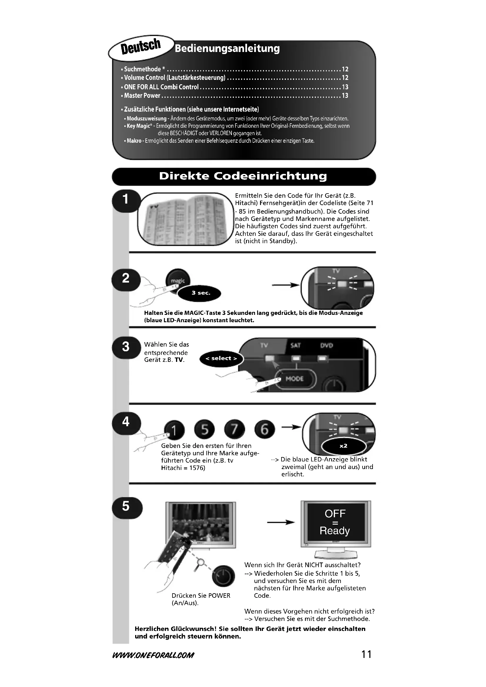 Ermitteln Sie den Code für Ihr Gerät (z.B.Hitachi) Fernsehgerät)in der Codeliste (Seite 71- 85 im Bedienungshandbuch). Die Codes sindnach Gerätetyp und Markenname aufgelistet.Die häufigsten Codes sind zuerst aufgeführt.Achten Sie darauf, dass Ihr Gerät eingeschaltetist (nicht in Standby).Halten Sie die MAGIC-Taste 3 Sekunden lang gedrückt, bis die Modus-Anzeige(blaue LED-Anzeige) konstant leuchtet.Geben Sie den ersten für IhrenGerätetyp und Ihre Marke aufge-führten Code ein (z.B. tvHitachi = 1576)--> Die blaue LED-Anzeige blinkt zweimal (geht an und aus) und erlischt.Wenn sich Ihr Gerät NICHT ausschaltet?--> Wiederholen Sie die Schritte 1 bis 5, und versuchen Sie es mit dem nächsten für Ihre Marke aufgelistetenCode.Wenn dieses Vorgehen nicht erfolgreich ist?--> Versuchen Sie es mit der Suchmethode. Herzlichen Glückwunsch! Sie sollten Ihr Gerät jetzt wieder einschaltenund erfolgreich steuern können.< select >Wählen Sie dasentsprechendeGerät z.B. TV.3 sec.