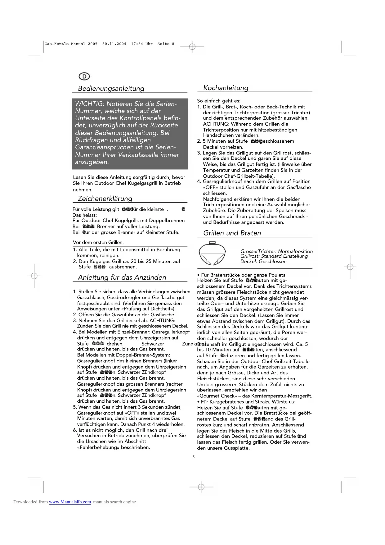 - Für Kurzgebratenes und Steaks, Würste u.a. Heizen Sie auf Stufe 5 Minuten mit ge- schlossenem Deckel vor. Die Bratstücke bei geöff- netem Deckel auf Stufe am Rand des Grill- rostes kurz und scharf anbraten. Anschliessend legen Sie das Fleisch in die Mitte des Grills, schliessen den Deckel, reduzieren auf Stufe und lassen das Fleisch fertig grillen. Oder Sie verwen- den unsere Gussplatte. Für volle Leistung gilt und für die kleinste . Das heisst: Für Outdoor Chef Kugelgrills mit Doppelbrenner: Bei beide Brenner auf voller Leistung. Bei nur der grosse Brenner auf kleinster Stufe. Zeichenerklärung Gas-Kettle Manual 2005 30.11.2004 17:54 Uhr Seite 8 Downloaded from www.Manualslib.com manuals search engineGrillen auf der Gusseisenplatte Grosser Trichter: Vulkanposition Grillrost: Entfernen und durch Gusseisenplatte ersetzen Deckel: Entfernen Optionales Zubehör: Gusseisenplatte
