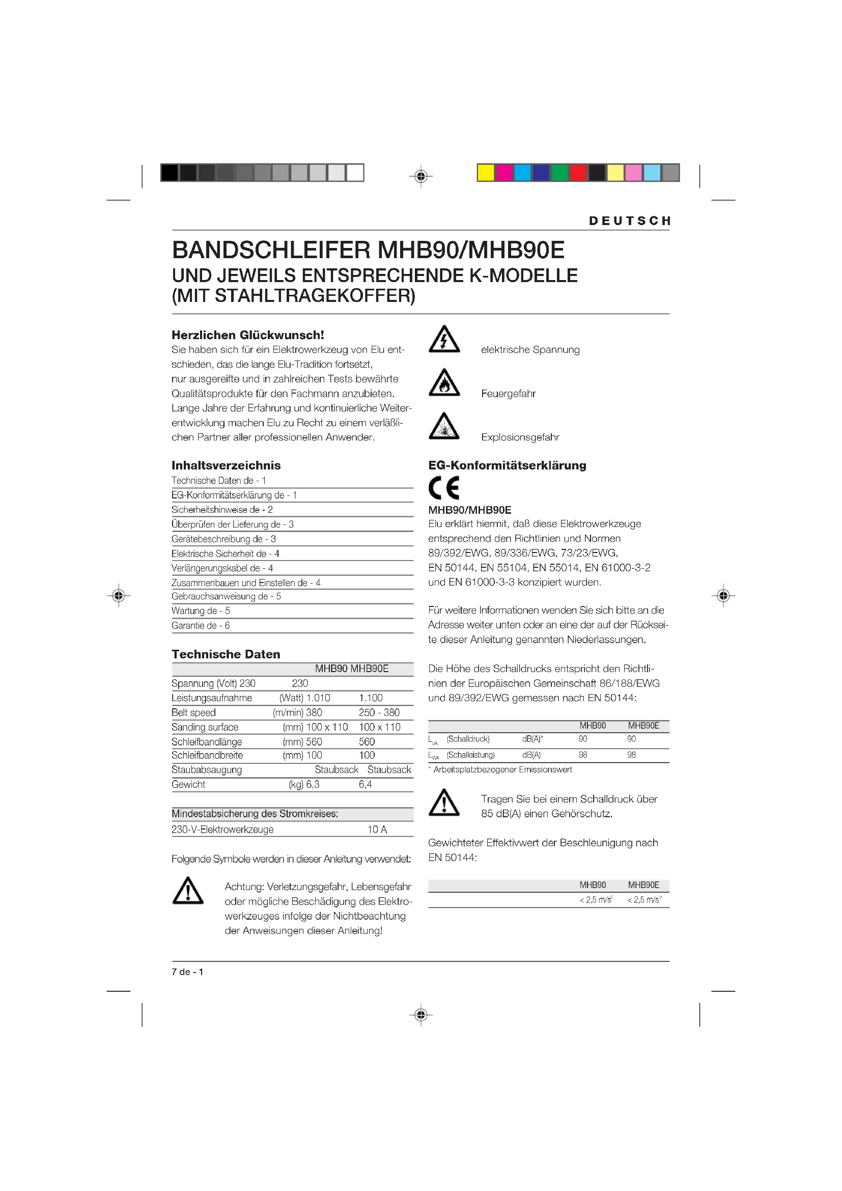 (Schalleistung) dB(A) 98 98* Arbeitsplatzbezogener Emissionswert Tragen Sie bei einem Schalldruck über 85 dB(A) einen Gehörschutz. Gewichteter Effektivwert der Beschleunigung nach EN 50144: MHB90 MHB90E< 2,5 m/s < 2,5 m/s 2DEUTSCH Direktor Produktentwicklung Horst Großmann Elu International, Richard-Klinger-Straße 40, D-65510, Idstein, Deutschland Sicherheitshinweise Beim Gebrauch von Elektrowerkzeugen sind zum Schutz gegen elektrischen Schlag, Verletzungs- und Feuergefahr die nationalen Sicherheitsvorschriften zu beachten. Lesen Sie folgende Sicherheitshinweise, bevor Sie das Elektrowerkzeug benutzen. Bewahren Sie diese Sicherheitshinweise gut auf! Allgemeines 1 Halten Sie Ihren Arbeitsbereich in Ordnung Unordnung im Arbeitsbereich führt zu Unfall- gefahren. 2 Berücksichtigen Sie Umgebungseinflüsse Setzen Sie Elektrowerkzeuge keiner Nässe aus. Sorgen Sie für eine gute Beleuchtung des Arbeits- bereiches. Benutzen Sie Elektrowerkzeuge nicht in der Nähe von brennbaren Flüssigkeiten oder Gasen. 3 Schützen Sie sich vor elektrischem Schlag Vermeiden Sie Körperberührung mit geerdeten Teilen, z.B. Rohren, Heizkörpern, Herden und Kühlschränken. Bei extremen Einsatzbedingungen (z.B. hohe Feuchtigkeit, Entwicklung von Metalls- taub usw.) kann die elektrische Sicherheit durch Vorschalten eines Trenntransformators oder eines Fehlerstrom-(FI-)Schutzschalters erhöht werden. 4 Halten Sie Kinder fern! Sorgen Sie dafür, daß Kinder das Werkzeug oder Kabel nicht berühren. Jugendliche unter 16 Jahren dürfen das Werkzeug nur unter fachlicher Anlei- tung benutzen. 5 Verlängerungskabel im Freien Verwenden Sie bei Arbeiten im Freien nur dafür zugelassene und entsprechend gekennzeichnete Verlängerungskabel. 6 Bewahren Sie Ihre Werkzeuge sicher auf Unbenutzte Werkzeuge sollten in trockenen, de - 2 8 verschlossenen Räumen und für Kinder nicht erreichbar aufbewahrt werden. 7 Tragen Sie geeignete Arbeitskleidung Tragen Sie keine weite Kleidung oder Schmuck. Sie können von sich bewegenden Teilen erfaßt werden. Beim Arbeiten im Freien sind Arbeitshand- schuhe und rutschfestes Schuhwerk empfehlens- wert. Tragen Sie bei langen Haaren ein Haarnetz. 8 Benutzen Sie eine Schutzbrille und verwenden Sie eine Atemmaske bei staub- und spanerzeugenden Arbeiten. 9 Beachten Sie den Höchstschalldruck Tragen Sie bei einem Schalldruck über 85 dB(A) einen geeigneten Gehörschutz. 10 Sichern Sie das Werkstück Benutzen Sie Spannvorrichtungen oder einen Schraubstock, um das Werkstück festzuhalten. Es ist damit sicherer gehalten und ermöglicht die Bedienung des Elektrowerkzeuges mit beiden Händen. 11 Achten Sie auf einen sicheren Stand Achten Sie auf einen sicheren Stand, um in jeder Arbeitsposition das Gleichgewicht zu halten. 12 Vermeiden Sie unbeabsichtigtes Einschalten Tragen Sie keine an das Stromnetz angeschlos- senen Elektrowerkzeuge mit dem Finger am EIN-/AUS-Schalter. Vergewissern Sie sich davon, daß der Schalter beim Anschluß an das Strom- netz ausgeschaltet ist. 13 Seien Sie stets aufmerksam Konzentrieren Sie sich auf Ihre Arbeit. Gehen Sie vernünftig vor. Verwenden Sie das Werkzeug nicht, wenn Sie müde sind. 14 Ziehen Sie den Netzstecker Schalten Sie das Gerät ab und warten Sie, bis das Werkzeug die Ruhestellung erreicht hat, bevor Sie den Arbeitsplatz verlassen. Bei Nicht- gebrauch, vor der Wartung und beim Werkzeug- wechsel ist der Netzstecker zu ziehen. 15 Lassen Sie keine Werkzeugschlüssel stecken Überprüfen Sie vor dem Einschalten, ob die Schlüssel und Einstellwerkzeuge entfernt sind. 16 Benutzen Sie das richtige Werkzeug Die bestimmungsgemäße Verwendung ist in dieser Betriebsanleitung beschrieben. Verwenden Sie keine zu schwachen Werkzeuge oder Vorsatz- geräte für schwere Arbeiten. Mit dem richtigen Werkzeug erzielen Sie eine optimale Qualität und gewährleisten Ihre persönliche Sicherheit.Warnung! Das Verwenden anderer als der in dieser Anleitung empfohlenen Vorsatzgeräte und Zubehörteile oder die Ausführung von Arbeiten mit diesem Elektrowerkzeug, die nicht der bestim- mungsgemäßen Verwendung entsprechen, kann zu Unfallgefahren führen. 17 Behandeln Sie das Kabel sorgfältig Tragen Sie das Werkzeug nicht am Kabel und benutzen Sie das Kabel nicht, um den Stecker aus der Steckdose zu ziehen. Schützen Sie das Kabel vor Hitze, Öl und scharfen Kanten. 18 Pflegen Sie Ihre Werkzeuge mit Sorgfalt Halten Sie Ihre Werkzeuge scharf und sauber, um gut und sicher arbeiten zu können. Befolgen Sie die Wartungsvorschriften und die Hinweise für den Werkzeugwechsel. Kontrollieren Sie regelmäßig den Stecker und das Kabel und lassen Sie diese bei Beschädigung von einer Elu-Kundendienst- werkstatt erneuern. Kontrollieren Sie Verlänge- rungskabel regelmäßig und ersetzen Sie sie im Falle einer Beschädigung. Halten Sie alle Schalter trocken, sauber und frei von Öl und Fett. 19 Kontrollieren Sie Ihr Elektrowerkzeug auf Beschädigungen Vor Gebrauch ist das Elektrowerkzeug auf ein- wandfreie und bestimmungsgemäße Funktion zu überprüfen. Überprüfen Sie, ob die beweglichen Teile einwandfrei funktionieren und ob Teile beschädigt sind. Sämtliche Teile müssen richtig montiert sein, um den einwandfreien Betrieb des Elektrowerkzeuges zu gewährleisten. Beschädigte Teile und Schutzvorrichtungen müssen vorschriftsgemäß repariert oder ausge- wechselt werden. Benutzen Sie das Elektro- werkzeug nicht, wenn der Schalter defekt ist. Beschädigte Schalter müssen durch eine Elu- Kundendienstwerkstatt ersetzt werden. 20 Lassen Sie Reparaturen nur von einer Elu- Kundendienstwerkstatt ausführen Dieses Elektrowerkzeug entspricht den einschlä- gigen Sicherheitsbestimmungen. Reparaturen dürfen nur von einer Elu-Kundendienstwerkstatt ausgeführt werden, andernfalls kann Unfallgefahr für den Betreiber entstehen. Schleifen von Farbe Beachten Sie die geltenden Regeln zum Schleifen von Farbe. Insbesondere sind folgende Punkte zu berücksichtigen: 9 de - 3 DEUTSCH 1 Verwenden Sie zur Staub