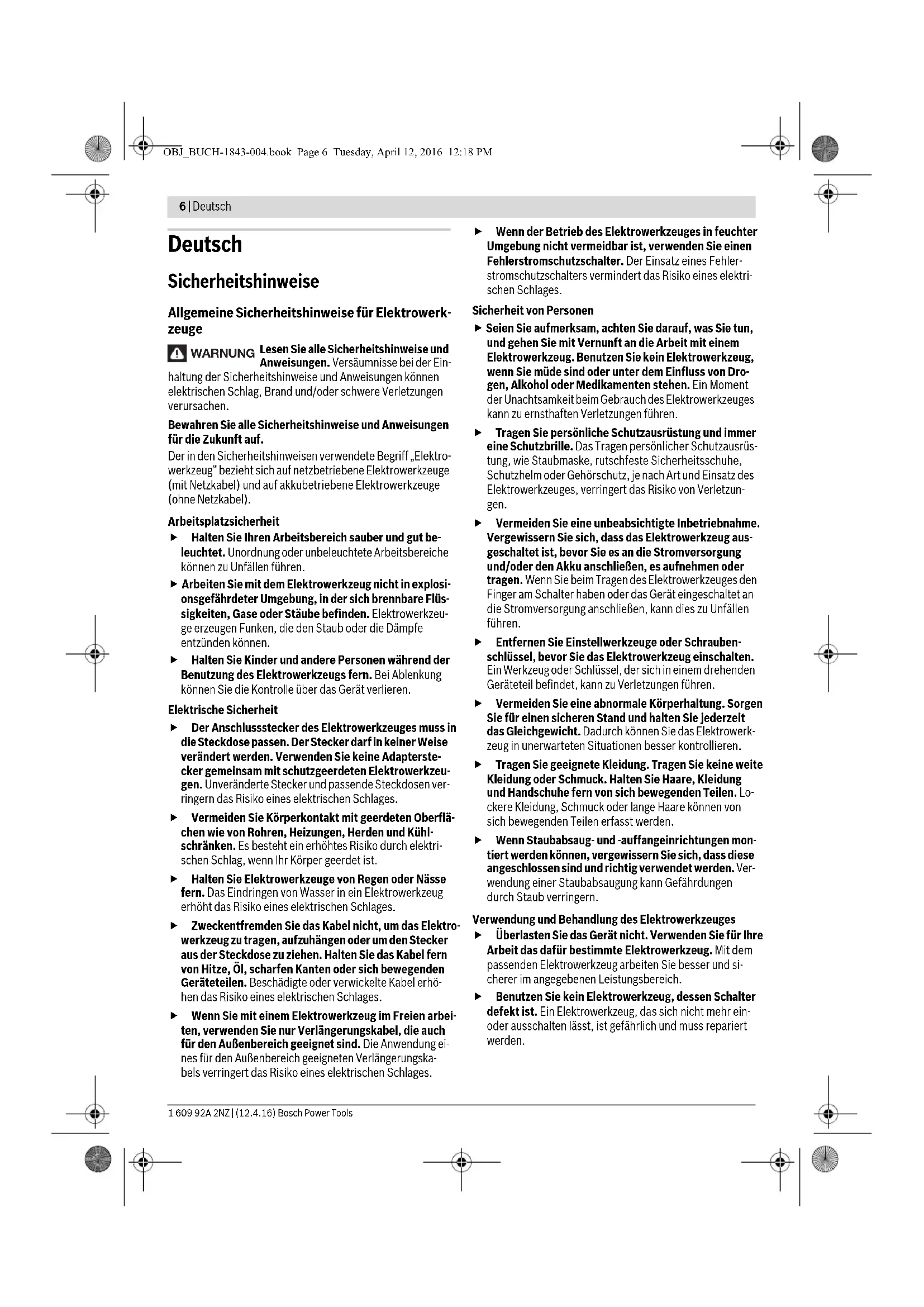 OBJ_BUCH-1843-004.book Page 5 Tuesday, April 12, 2016 12:18 PM6 | Deutsch 1 609 92A 2NZ | (12.4.16) Bosch Power Tools Deutsch Sicherheitshinweise Allgemeine Sicherheitshinweise für Elektrowerk- zeuge Lesen Sie alle Sicherheitshinweise und Anweisungen. Versäumnisse bei der Ein- haltung der Sicherheitshinweise und Anweisungen können elektrischen Schlag, Brand und/oder schwere Verletzungen verursachen. Bewahren Sie alle Sicherheitshinweise und Anweisungen für die Zukunft auf. Der in den Sicherheitshinweisen verwendete Begriff „Elektro- werkzeug“ bezieht sich auf netzbetriebene Elektrowerkzeuge (mit Netzkabel) und auf akkubetriebene Elektrowerkzeuge (ohne Netzkabel). Arbeitsplatzsicherheit Halten Sie Ihren Arbeitsbereich sauber und gut be- leuchtet. Unordnung oder unbeleuchtete Arbeitsbereiche können zu Unfällen führen. Arbeiten Sie mit dem Elektrowerkzeug nicht in explosi- onsgefährdeter Umgebung, in der sich brennbare Flüs- sigkeiten, Gase oder Stäube befinden. Elektrowerkzeu- ge erzeugen Funken, die den Staub oder die Dämpfe entzünden können. Halten Sie Kinder und andere Personen während der Benutzung des Elektrowerkzeugs fern. Bei Ablenkung können Sie die Kontrolle über das Gerät verlieren. Elektrische Sicherheit Der Anschlussstecker des Elektrowerkzeuges muss in die Steckdose passen. Der Stecker darf in keiner Weise verändert werden. Verwenden Sie keine Adapterste- cker gemeinsam mit schutzgeerdeten Elektrowerkzeu- gen. Unveränderte Stecker und passende Steckdosen ver- ringern das Risiko eines elektrischen Schlages. Vermeiden Sie Körperkontakt mit geerdeten Oberflä- chen wie von Rohren, Heizungen, Herden und Kühl- schränken. Es besteht ein erhöhtes Risiko durch elektri- schen Schlag, wenn Ihr Körper geerdet ist. Halten Sie Elektrowerkzeuge von Regen oder Nässe fern. Das Eindringen von Wasser in ein Elektrowerkzeug erhöht das Risiko eines elektrischen Schlages. Zweckentfremden Sie das Kabel nicht, um das Elektro- werkzeug zu tragen, aufzuhängen oder um den Stecker aus der Steckdose zu ziehen. Halten Sie das Kabel fern von Hitze, Öl, scharfen Kanten oder sich bewegenden Geräteteilen. Beschädigte oder verwickelte Kabel erhö- hen das Risiko eines elektrischen Schlages. Wenn Sie mit einem Elektrowerkzeug im Freien arbei- ten, verwenden Sie nur Verlängerungskabel, die auch für den Außenbereich geeignet sind. Die Anwendung ei- nes für den Außenbereich geeigneten Verlängerungska- bels verringert das Risiko eines elektrischen Schlages. Wenn der Betrieb des Elektrowerkzeuges in feuchter Umgebung nicht vermeidbar ist, verwenden Sie einen Fehlerstromschutzschalter. Der Einsatz eines Fehler- stromschutzschalters vermindert das Risiko eines elektri- schen Schlages. Sicherheit von Personen Seien Sie aufmerksam, achten Sie darauf, was Sie tun, und gehen Sie mit Vernunft an die Arbeit mit einem Elektrowerkzeug. Benutzen Sie kein Elektrowerkzeug, wenn Sie müde sind oder unter dem Einfluss von Dro- gen, Alkohol oder Medikamenten stehen. Ein Moment der Unachtsamkeit beim Gebrauch des Elektrowerkzeuges kann zu ernsthaften Verletzungen führen. Tragen Sie persönliche Schutzausrüstung und immer eine Schutzbrille. Das Tragen persönlicher Schutzausrüs- tung, wie Staubmaske, rutschfeste Sicherheitsschuhe, Schutzhelm oder Gehörschutz, je nach Art und Einsatz des Elektrowerkzeuges, verringert das Risiko von Verletzun- gen. Vermeiden Sie eine unbeabsichtigte Inbetriebnahme. Vergewissern Sie sich, dass das Elektrowerkzeug aus- geschaltet ist, bevor Sie es an die Stromversorgung und/oder den Akku anschließen, es aufnehmen oder tragen. Wenn Sie beim Tragen des Elektrowerkzeuges den Finger am Schalter haben oder das Gerät eingeschaltet an die Stromversorgung anschließen, kann dies zu Unfällen führen. Entfernen Sie Einstellwerkzeuge oder Schrauben- schlüssel, bevor Sie das Elektrowerkzeug einschalten. Ein Werkzeug oder Schlüssel, der sich in einem drehenden Geräteteil befindet, kann zu Verletzungen führen. Vermeiden Sie eine abnormale Körperhaltung. Sorgen Sie für einen sicheren Stand und halten Sie jederzeit das Gleichgewicht. Dadurch können Sie das Elektrowerk- zeug in unerwarteten Situationen besser kontrollieren. Tragen Sie geeignete Kleidung. Tragen Sie keine weite Kleidung oder Schmuck. Halten Sie Haare, Kleidung und Handschuhe fern von sich bewegenden Teilen. Lo- ckere Kleidung, Schmuck oder lange Haare können von sich bewegenden Teilen erfasst werden. Wenn Staubabsaug- und -auffangeinrichtungen mon- tiert werden können, vergewissern Sie sich, dass diese angeschlossen sind und richtig verwendet werden. Ver- wendung einer Staubabsaugung kann Gefährdungen durch Staub verringern. Verwendung und Behandlung des Elektrowerkzeuges Überlasten Sie das Gerät nicht. Verwenden Sie für Ihre Arbeit das dafür bestimmte Elektrowerkzeug. Mit dem passenden Elektrowerkzeug arbeiten Sie besser und si- cherer im angegebenen Leistungsbereich. Benutzen Sie kein Elektrowerkzeug, dessen Schalter defekt ist. Ein Elektrowerkzeug, das sich nicht mehr ein- oder ausschalten lässt, ist gefährlich und muss repariert werden. WARNUNG OBJ_BUCH-1843-004.book Page 6 Tuesday, April 12, 2016 12:18 PMDeutsch | 7 Bosch Power Tools 1 609 92A 2NZ | (12.4.16) Ziehen Sie den Stecker aus der Steckdose und/oder entfernen Sie den Akku, bevor Sie Geräteeinstellungen vornehmen, Zubehörteile wechseln oder das Gerät weglegen. Diese Vorsichtsmaßnahme verhindert den un- beabsichtigten Start des Elektrowerkzeuges. Bewahren Sie unbenutzte Elektrowerkzeuge außer- halb der Reichweite von Kindern auf. Lassen Sie Perso- nen das Gerät nicht benutzen, die mit diesem nicht ver- traut sind oder diese Anweisungen nicht gelesen haben. Elektrowerkzeuge sind gefährlich, wenn sie von unerfahrenen Personen benutzt werden. Pflegen Sie Elektrowerkzeuge mit Sorgfalt. Kontrollie- ren Sie, ob bewegliche Teile einwandfrei funktionieren und nicht klemmen, ob Teile gebrochen oder so be- schädigt sind, dass die Fun