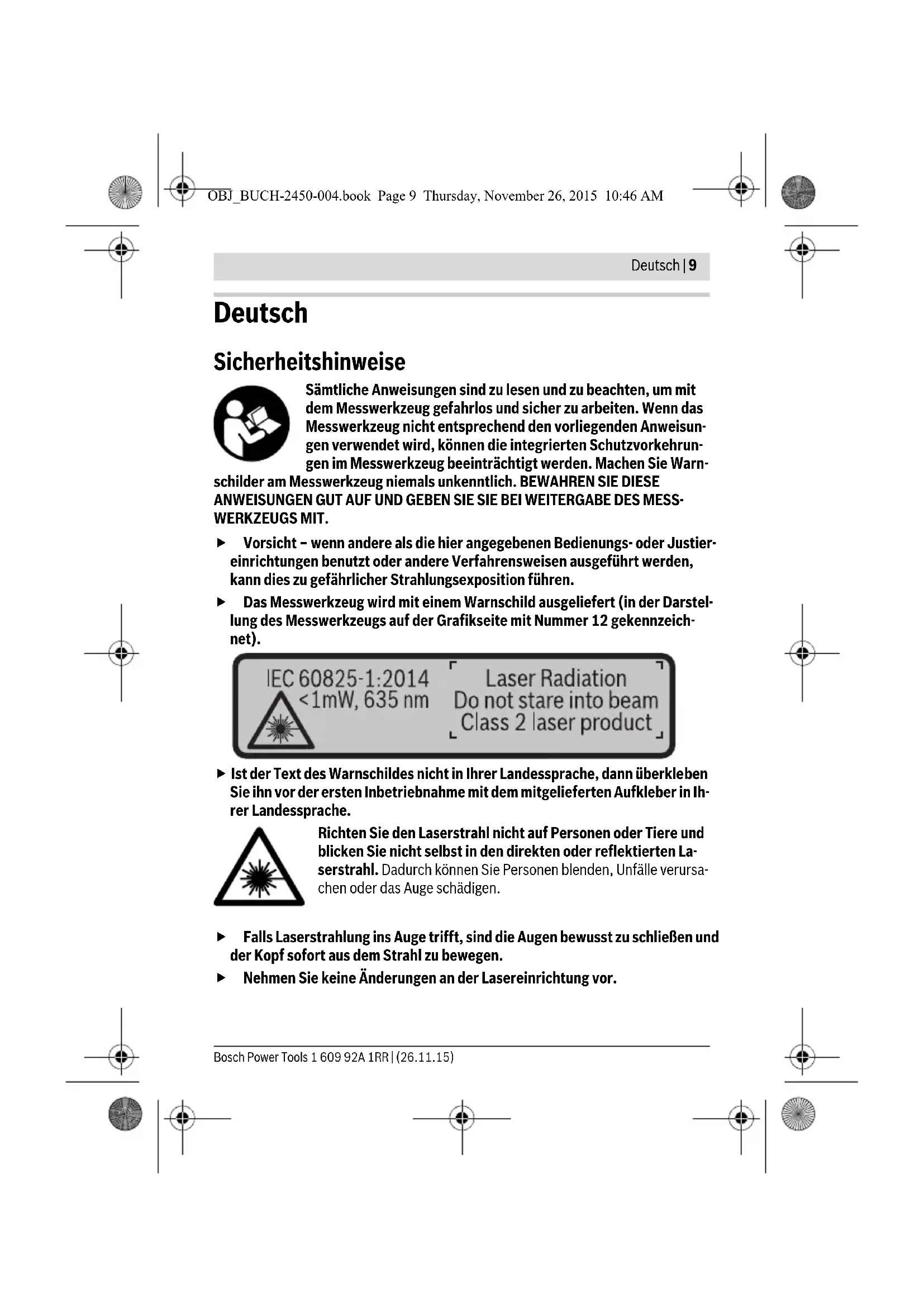 - Abgebildetes oder beschriebenes Zubehör gehört nicht zum Standard-Lieferumfang. Henk Becker Executive Vice President Engineering Helmut Heinzelmann Head of Product Certification PT/ETM9 OBJ_BUCH-2450-004.book Page 13 Thursday, November 26, 2015 10:46 AM14 | Deutsch 1 609 92A 1RR | (26.11.15) Bosch Power Tools Anzeigenelemente (Auswahl) a Status Bluetooth® b Bezugsebene der Messung c Batterieanzeige d Messwertzeilen e Ergebniszeile f Messfunktionen g Anzeige Neigungswinkel h Statusleiste i Grundeinstellungen Montage Batterien einsetzen/wechseln Für den Betrieb des Messwerkzeugs wird die Verwendung von Alkali-Mangan-Batteri- en oder Akkus empfohlen. Mit 1,2-V-Akkus sind eventuell weniger Messungen möglich als mit 1,5-V-Batterien. Zum Öffnen des Batteriefachdeckels 9 drücken Sie die Arretierung 10 und nehmen den Batteriefachdeckel ab. Setzen Sie die Batterien bzw. Akkus ein. Achten Sie dabei auf die richtige Polung entsprechend der Darstellung auf der Innenseite des Batterie- fachs. Wenn das leere Batteriesymbol erstmals im Display erscheint, dann sind noch ca. 100 Messungen möglich. Wenn das Batteriesymbol leer ist und rot blinkt, dann sind keine Messungen mehr möglich. Wechseln Sie die Batterien bzw. Akkus. Ersetzen Sie immer alle Batterien bzw. Akkus gleichzeitig. Verwenden Sie nur Batte- rien oder Akkus eines Herstellers und mit gleicher Kapazität. Nehmen Sie die Batterien bzw. Akkus aus dem Messwerkzeug, wenn Sie es längere Zeit nicht benutzen. Die Batterien und Akkus können bei längerer Lage- rung korrodieren und sich selbst entladen. Bluetooth® aktiviert, keine Verbindung hergestellt Bluetooth® aktiviert, Verbindung hergestellt OBJ_BUCH-2450-004.book Page 14 Thursday, November 26, 2015 10:46 AMDeutsch | 15 Bosch Power Tools 1 609 92A 1RR | (26.11.15) Betrieb Inbetriebnahme Lassen Sie das eingeschaltete Messwerkzeug nicht unbeaufsichtigt und schalten Sie das Messwerkzeug nach Gebrauch ab. Andere Personen könnten vom Laserstrahl geblendet werden. Schützen Sie das Messwerkzeug vor Nässe und direkter Sonneneinstrahlung. Setzen Sie das Messwerkzeug keinen extremen Temperaturen oder Tempera- turschwankungen aus. Lassen Sie es z.B. nicht längere Zeit im Auto liegen. Las- sen Sie das Messwerkzeug bei größeren Temperaturschwankungen erst austem- perieren, bevor Sie es in Betrieb nehmen. Bei extremen Temperaturen oder Temperaturschwankungen kann die Präzision des Messwerkzeugs beeinträchtigt werden. Vermeiden Sie heftige Stöße oder Stürze des Messwerkzeuges. Nach starken äußeren Einwirkungen auf das Messwerkzeug sollten Sie vor dem Weiterarbeiten immer eine Genauigkeitsüberprüfung durchführen (siehe „Genauigkeitsüberprü- fung der Entfernungsmessung“, Seite 25). Ein-/Ausschalten –Zum Einschalten des Messwerkzeugs und des Lasers drücken Sie kurz auf die Messtaste 2 []. –Zum Einschalten des Messwerkzeugs ohne Laser drücken Sie kurz auf die Ein- Aus-Taste 5 []. Richten Sie den Laserstrahl nicht auf Personen oder Tiere und blicken Sie nicht selbst in den Laserstrahl, auch nicht aus größerer Entfernung. Zum Ausschalten des Messwerkzeugs halten Sie die Ein-Aus-Taste 5 [] gedrückt. Beim Ausschalten des Messwerkzeugs bleiben die im Speicher befindlichen Werte und Geräteeinstellungen erhalten. Messvorgang Nach dem Einschalten befindet sich das Messwerkzeug in der Funktion Längenmes- sung. Für eine andere Messfunktion drücken Sie die Taste 7 [Func]. Wählen Sie die gewünschte Messfunktion mit der Taste 3 [+] oder Taste 8 [–] aus (siehe „Messfunk- tionen“, Seite 17). Aktivieren Sie die Messfunktion mit Taste 7 [Func] oder mit der Messtaste 2 []. Als Bezugsebene für die Messung ist nach dem Einschalten die Hinterkante des Mess- werkzeugs ausgewählt. Zum Wechsel der Bezugsebene siehe „Bezugsebene wählen“, Seite 16. OBJ_BUCH-2450-004.book Page 15 Thursday, November 26, 2015 10:46 AM16 | Deutsch 1 609 92A 1RR | (26.11.15) Bosch Power Tools Legen Sie das Messwerkzeug an den gewünschten Startpunkt der Messung (z.B. Wand) an. Hinweis: Wurde das Messwerkzeug mit der Ein-Aus-Taste 5 [ ] eingeschaltet, drü- cken Sie kurz auf die Messtaste 2 [ ] um den Laser einzuschalten. Drücken Sie zum Auslösen der Messung kurz auf die Messtaste 2 []. Danach wird der Laserstrahl ausgeschaltet. Für eine weitere Messung wiederholen Sie diesen Vor- gang. Richten Sie den Laserstrahl nicht auf Personen oder Tiere und blicken Sie nicht selbst in den Laserstrahl, auch nicht aus größerer Entfernung. Hinweis: Der Messwert erscheint typischerweise innerhalb von 0,5 s und spätestens nach ca. 4 s. Die Dauer der Messung hängt ab von der Entfernung, den Lichtverhält- nissen und den Reflexionseigenschaften der Zielfläche. Nach Beendigung der Mes- sung wird der Laserstrahl automatisch abgeschaltet. Bezugsebene wählen (siehe Bild A) Für die Messung können Sie unter drei verschiedenen Bezugsebenen wählen: – der Hinterkante des Messwerkzeugs (z.B. beim Anlegen an Wände), – der Vorderkante des Messwerkzeugs (z.B. beim Messen ab einer Tischkante), – der Mitte des Gewindes 13 (z.B. für Messungen mit Stativ). Drücken Sie zur Auswahl der Bezugsebene die Taste 4. Wählen Sie mit Taste 3 [+] oder Taste 8 [–] oder Taste 4 die gewünschte Bezugsebene aus. Nach jedem Ein- schalten des Messwerkzeugs ist die Hinterkante des Messwerkzeugs als Bezugsebe- ne voreingestellt. Menü „Grundeinstellungen“ Um in das Menü „Grundeinstellungen“ (i) zu gelangen, halten Sie die Taste 7 [Func] gedrückt. Wählen Sie die jeweilige Grundeinstellung und ihre Einstellung aus. Um das Menü „Grundeinstellungen“ zu verlassen, drücken Sie die Ein-Aus-Taste 5 []. Displaybeleuchtung Die Displaybeleuchtung ist dauerhaft eingeschaltet. Erfolgt kein Tastendruck, wird die Displaybeleuchtung nach ca. 20 Sekunden zur Schonung der Batterien/Akkus ge- dimmt. OBJ_BUCH-2450-004.book Page 16 Thursday, November 26, 2015 10:46 AMDeutsch | 17 Bosch Power Tools 1 609 92A 1RR | (26.11.15) Messfun