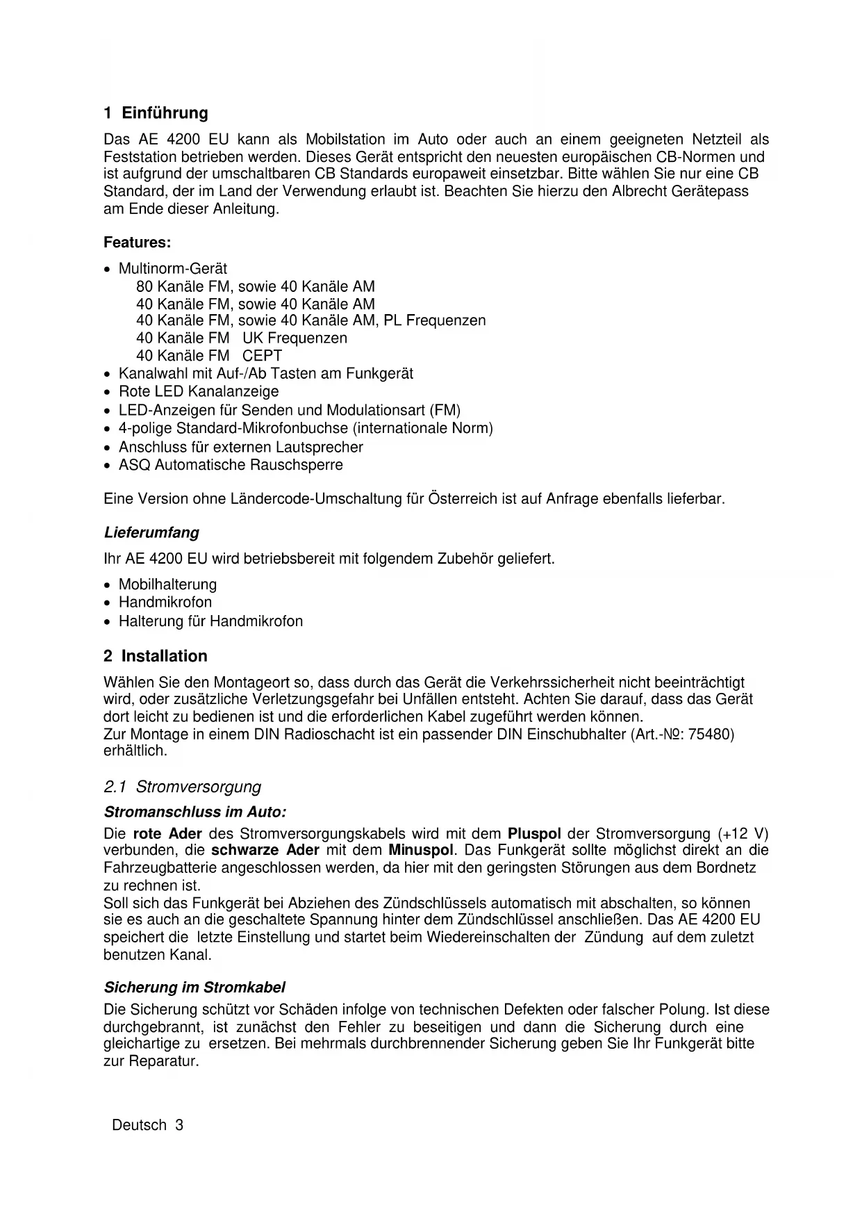 Stromanschluss im Auto: Die rote Ader des Stromversorgungskabels wird mit dem Pluspol der Stromversorgung (+12 V) verbunden, die schwarze Ader mit dem Minuspol. Das Funkgerät sollte möglichst direkt an die Fahrzeugbatterie angeschlossen werden, da hier mit den geringsten Störungen aus dem Bordnetz zu rechnen ist. Soll sich das Funkgerät bei Abziehen des Zündschlüssels automatisch mit abschalten, so können sie es auch an die geschaltete Spannung hinter dem Zündschlüssel anschließen. Das AE 4200 EU speichert die letzte Einstellung und startet beim Wiedereinschalten der Zündung auf dem zuletzt benutzen Kanal. Sicherung im Stromkabel Die Sicherung schützt vor Schäden infolge von technischen Defekten oder falscher Polung. Ist diese durchgebrannt, ist zunächst den Fehler zu beseitigen und dann die Sicherung durch eine gleichartige zu ersetzen. Bei mehrmals durchbrennender Sicherung geben Sie Ihr Funkgerät bitte zur Reparatur.4 Deutsch Hinweise insbesondere für LKW-Fahrer Die höchstzulässige Betriebsspannung des AE4200 EU beträgt 15 V. Die Sendeleistung ist bei diesem Gerät stabilisiert und bleibt auch bei Erhöhung der Spannung konstant. Bei 24 Volt Bordnetz ist ein geeigneter Spannungswandler von 24 V auf 12 V erforderlich. Die kompakten und verlustarmen Schaltwandler mögen für übliche KFZ-Stromverbraucher, wie Radios, Kühlboxen oder Kaffeemaschinen hinreichend entstört sein, können jedoch trotzdem trotzdem den Funkempfang beeinträchtigen. Für einwandfreien CB-Empfang bei Betrieb mit Schaltwandlern können wir demnach keine Gewähr übernehmen. Die Funkantenne soll soweit wie möglich von anderen Antennen und Störquellen montiert werden. CB-Antennen müssen in der Regel in oder auf Metallflächen montiert werden. Eine hinreichend große Metallfläche ist für die Funktion der Antenne unbedingt erforderlich. Für die Montage auf einem GFK Fahrerhaus oder Kunststoff- Windabweiser, können massefreie Spezialantennen (z.B. GL 27) benutzt werden. Betrieb über Netzteil am 230 V-Stromnetz Betreiben Sie Ihr Funkgerät nur an einem speziellen, stabilisierten Funk-Netzteil, welches mindestens 1.5 - 2 Ampere bei 12 -13.8 Volt Gleichspannung liefern kann. Ein gut geeignetes Netzteil von Albrecht ist Artikel-Nr. 47500. Unstabilisierte Netzteile oder Batterie-Ladegeräte sind ungeeignet und können zu Schäden führen. Die Plus Ader (rot) soll mit dem Plus (+) Anschluss des Netzteiles, die schwarze Ader mit dem Minus (-) Anschluss des Netzteils verbunden werden.