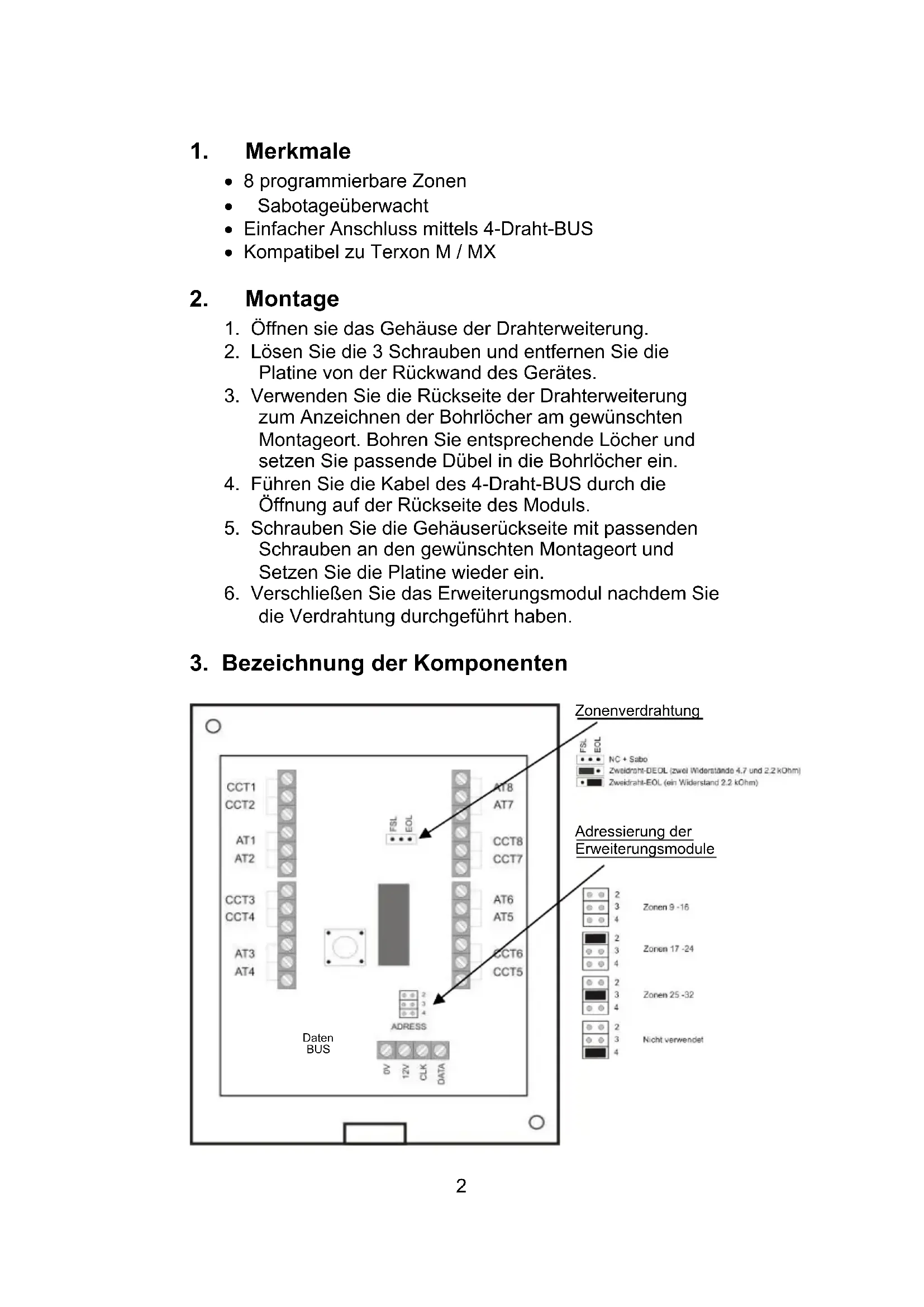 Am Daten-BUS werden, wie in der Installationsanleitung der Zentrale beschrieben, die 4 Kabel vom Kommunikationsbus der Zentrale angeschlossen. Weitere Module werden parallel an diesen BUS angeschlossen. Die Unterscheidung der Zonenbereiche wird durch die Adressierung der Module vorgenommen.