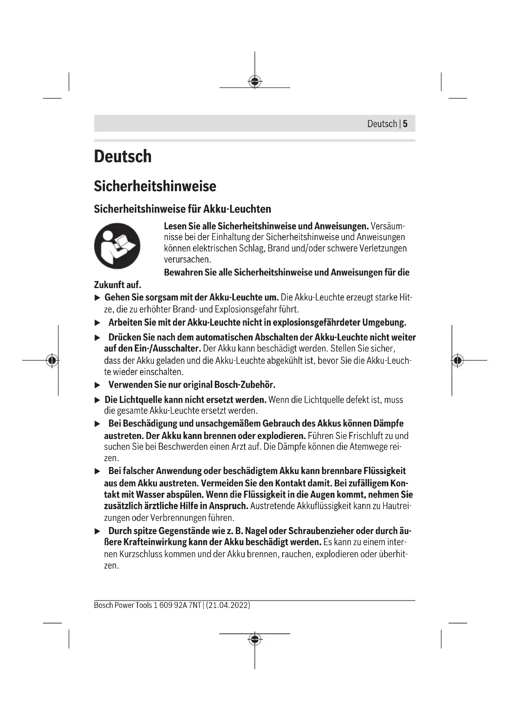 1 609 92A 7NT | (21.04.2022) Bosch Power ToolsDeutsch | 5 Deutsch Sicherheitshinweise Sicherheitshinweise für Akku-Leuchten Lesen Sie alle Sicherheitshinweise und Anweisungen. Versäum- nisse bei der Einhaltung der Sicherheitshinweise und Anweisungen können elektrischen Schlag, Brand und/oder schwere Verletzungen verursachen. Bewahren Sie alle Sicherheitshinweise und Anweisungen für die Zukunft auf. u Gehen Sie sorgsam mit der Akku-Leuchte um. Die Akku-Leuchte erzeugt starke Hit- ze, die zu erhöhter Brand- und Explosionsgefahr führt. u Arbeiten Sie mit der Akku-Leuchte nicht in explosionsgefährdeter Umgebung.u Drücken Sie nach dem automatischen Abschalten der Akku-Leuchte nicht weiter auf den Ein-/Ausschalter. Der Akku kann beschädigt werden. Stellen Sie sicher, dass der Akku geladen und die Akku-Leuchte abgekühlt ist, bevor Sie die Akku-Leuch- te wieder einschalten. u Verwenden Sie nur original Bosch-Zubehör. u Die Lichtquelle kann nicht ersetzt werden. Wenn die Lichtquelle defekt ist, muss die gesamte Akku-Leuchte ersetzt werden. u Bei Beschädigung und unsachgemäßem Gebrauch des Akkus können Dämpfe austreten. Der Akku kann brennen oder explodieren. Führen Sie Frischluft zu und suchen Sie bei Beschwerden einen Arzt auf. Die Dämpfe können die Atemwege rei- zen. u Bei falscher Anwendung oder beschädigtem Akku kann brennbare Flüssigkeit aus dem Akku austreten. Vermeiden Sie den Kontakt damit. Bei zufälligem Kon- takt mit Wasser abspülen. Wenn die Flüssigkeit in die Augen kommt, nehmen Sie zusätzlich ärztliche Hilfe in Anspruch. Austretende Akkuflüssigkeit kann zu Hautrei- zungen oder Verbrennungen führen. u Durch spitze Gegenstände wie z. B. Nagel oder Schraubenzieher oder durch äu- ßere Krafteinwirkung kann der Akku beschädigt werden. Es kann zu einem inter- nen Kurzschluss kommen und der Akku brennen, rauchen, explodieren oder überhit- zen. Bosch Power Tools 1 609 92A 7NT | (21.04.2022)6 | Deutsch u Halten Sie den nicht benutzten Akku fern von Büroklammern, Münzen, Schlüs- seln, Nägeln, Schrauben oder anderen kleinen Metallgegenständen, die eine Überbrückung der Kontakte verursachen könnten. Ein Kurzschluss zwischen den Akkukontakten kann Verbrennungen oder Feuer zur Folge haben. u Öffnen Sie den Akku nicht. Es besteht die Gefahr eines Kurzschlusses. u Verwenden Sie den Akku nur in Produkten des Herstellers. Nur so wird der Akku vor gefährlicher Überlastung geschützt. Schützen Sie den Akku vor Hitze, z. B. auch vor dauernder Son- neneinstrahlung, Feuer, Schmutz, Wasser und Feuchtigkeit. Es besteht Explosions- und Kurzschlussgefahr. u Laden Sie die Akkus nur mit Ladegeräten auf, die vom Hersteller empfohlen wer- den. Durch ein Ladegerät, das für eine bestimmte Art von Akkus geeignet ist, besteht Brandgefahr, wenn es mit anderen Akkus verwendet wird. u Nehmen Sie den Akku vor allen Arbeiten an der Akku-Leuchte (z.B. Montage, Wartung etc.) sowie bei deren Transport und Aufbewahrung aus der Akku- Leuchte. Bei unbeabsichtigtem Betätigen des Ein-/Ausschalters besteht Verletzungs- gefahr. u Richten Sie den Lichtstrahl nicht auf Personen oder Tiere und blicken Sie nicht selbst in den Lichtstrahl, auch nicht aus größerer Entfernung. u Verwenden Sie die Akku-Leuchte nicht im Straßenverkehr. Die Akku-Leuchte ist nicht zur Beleuchtung im Straßenverkehr zugelassen. u Decken Sie den Leuchtenkopf nicht ab, während die Akku-Leuchte in Betrieb ist. Der Leuchtenkopf erwärmt sich im Betrieb und kann Verbrennungen verursachen, wenn sich diese Hitze staut. u Lassen Sie Kinder die Akku-Leuchte nicht benutzen. Sie ist für den professionellen Gebrauch bestimmt. Kinder können unbeabsichtigt sich selbst oder Personen blen- den. Produkt- und Leistungsbeschreibung Bestimmungsgemäßer Gebrauch Die Akku-Leuchte ist bestimmt für das ortsveränderliche, räumlich und zeitlich begrenz- te Ausleuchten in Innen- und Außenbereichen und ist nicht geeignet zur allgemeinen Raumbeleuchtung. 1 609 92A 7NT | (21.04.2022) Bosch Power ToolsDeutsch | 7 Abgebildete Komponenten Die Nummerierung der abgebildeten Komponenten bezieht sich auf die Darstellung der Akku-Leuchte auf der Grafikseite. (1) Akku
