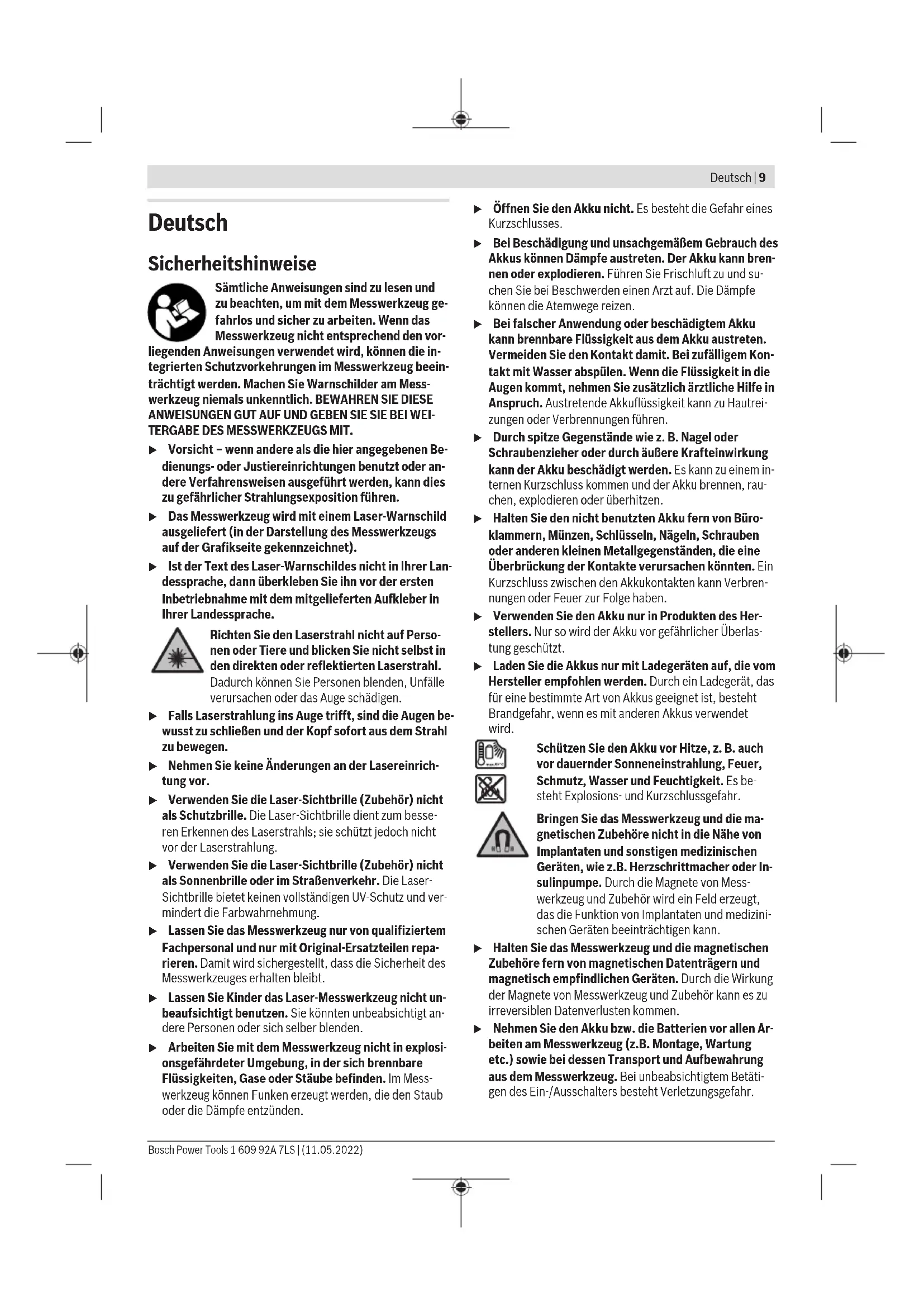 GCL 2-50 CG) (31) (21) (30) 1 608 M00 05B (GCL 2-50 C) 1 608 M00 05J (GCL 2-50 CG) (36) L-BOXX 136 1 600 A01 2G0 (34) (32) BT 150 0 601 096 B00 (33) BT 350 0 601 015 B00 (28) RC 2 0 601 069 C00 (35) AA1 Bosch Power Tools 1 609 92A 7LS | (11.05.2022)Deutsch | 9 Deutsch Sicherheitshinweise Sämtliche Anweisungen sind zu lesen und zu beachten, um mit dem Messwerkzeug ge- fahrlos und sicher zu arbeiten. Wenn das Messwerkzeug nicht entsprechend den vor- liegenden Anweisungen verwendet wird, können die in- tegrierten Schutzvorkehrungen im Messwerkzeug beein- trächtigt werden. Machen Sie Warnschilder am Mess- werkzeug niemals unkenntlich. BEWAHREN SIE DIESE ANWEISUNGEN GUT AUF UND GEBEN SIE SIE BEI WEI- TERGABE DES MESSWERKZEUGS MIT. u Vorsicht – wenn andere als die hier angegebenen Be- dienungs- oder Justiereinrichtungen benutzt oder an- dere Verfahrensweisen ausgeführt werden, kann dies zu gefährlicher Strahlungsexposition führen. u Das Messwerkzeug wird mit einem Laser-Warnschild ausgeliefert (in der Darstellung des Messwerkzeugs auf der Grafikseite gekennzeichnet). u Ist der Text des Laser-Warnschildes nicht in Ihrer Lan- dessprache, dann überkleben Sie ihn vor der ersten Inbetriebnahme mit dem mitgelieferten Aufkleber in Ihrer Landessprache. Richten Sie den Laserstrahl nicht auf Perso- nen oder Tiere und blicken Sie nicht selbst in den direkten oder reflektierten Laserstrahl. Dadurch können Sie Personen blenden, Unfälle verursachen oder das Auge schädigen. u Falls Laserstrahlung ins Auge trifft, sind die Augen be- wusst zu schließen und der Kopf sofort aus dem Strahl zu bewegen. u Nehmen Sie keine Änderungen an der Lasereinrich- tung vor. u Verwenden Sie die Laser-Sichtbrille (Zubehör) nicht als Schutzbrille. Die Laser-Sichtbrille dient zum besse- ren Erkennen des Laserstrahls; sie schützt jedoch nicht vor der Laserstrahlung. u Verwenden Sie die Laser-Sichtbrille (Zubehör) nicht als Sonnenbrille oder im Straßenverkehr. Die Laser- Sichtbrille bietet keinen vollständigen UV-Schutz und ver- mindert die Farbwahrnehmung. u Lassen Sie das Messwerkzeug nur von qualifiziertem Fachpersonal und nur mit Original-Ersatzteilen repa- rieren. Damit wird sichergestellt, dass die Sicherheit des Messwerkzeuges erhalten bleibt. u Lassen Sie Kinder das Laser-Messwerkzeug nicht un- beaufsichtigt benutzen. Sie könnten unbeabsichtigt an- dere Personen oder sich selber blenden. u Arbeiten Sie mit dem Messwerkzeug nicht in explosi- onsgefährdeter Umgebung, in der sich brennbare Flüssigkeiten, Gase oder Stäube befinden. Im Mess- werkzeug können Funken erzeugt werden, die den Staub oder die Dämpfe entzünden. u Öffnen Sie den Akku nicht. Es besteht die Gefahr eines Kurzschlusses. u Bei Beschädigung und unsachgemäßem Gebrauch des Akkus können Dämpfe austreten. Der Akku kann bren- nen oder explodieren. Führen Sie Frischluft zu und su- chen Sie bei Beschwerden einen Arzt auf. Die Dämpfe können die Atemwege reizen. u Bei falscher Anwendung oder beschädigtem Akku kann brennbare Flüssigkeit aus dem Akku austreten. Vermeiden Sie den Kontakt damit. Bei zufälligem Kon- takt mit Wasser abspülen. Wenn die Flüssigkeit in die Augen kommt, nehmen Sie zusätzlich ärztliche Hilfe in Anspruch. Austretende Akkuflüssigkeit kann zu Hautrei- zungen oder Verbrennungen führen. u Durch spitze Gegenstände wie z. B. Nagel oder Schraubenzieher oder durch äußere Krafteinwirkung kann der Akku beschädigt werden. Es kann zu einem in- ternen Kurzschluss kommen und der Akku brennen, rau- chen, explodieren oder überhitzen. u Halten Sie den nicht benutzten Akku fern von Büro- klammern, Münzen, Schlüsseln, Nägeln, Schrauben oder anderen kleinen Metallgegenständen, die eine Überbrückung der Kontakte verursachen könnten. Ein Kurzschluss zwischen den Akkukontakten kann Verbren- nungen oder Feuer zur Folge haben. u Verwenden Sie den Akku nur in Produkten des Her- stellers. Nur so wird der Akku vor gefährlicher Überlas- tung geschützt. u Laden Sie die Akkus nur mit Ladegeräten auf, die vom Hersteller empfohlen werden. Durch ein Ladegerät, das für eine bestimmte Art von Akkus geeignet ist, besteht Brandgefahr, wenn es mit anderen Akkus verwendet wird. Schützen Sie den Akku vor Hitze, z. B. auch vor dauernder Sonneneinstrahlung, Feuer, Schmutz, Wasser und Feuchtigkeit. Es be- steht Explosions- und Kurzschlussgefahr. Bringen Sie das Messwerkzeug und die ma- gnetischen Zubehöre nicht in die Nähe von Implantaten und sonstigen medizinischen Geräten, wie z.B. Herzschrittmacher oder In- sulinpumpe. Durch die Magnete von Mess- werkzeug und Zubehör wird ein Feld erzeugt, das die Funktion von Implantaten und medizini- schen Geräten beeinträchtigen kann. u Halten Sie das Messwerkzeug und die magnetischen Zubehöre fern von magnetischen Datenträgern und magnetisch empfindlichen Geräten. Durch die Wirkung der Magnete von Messwerkzeug und Zubehör kann es zu irreversiblen Datenverlusten kommen. u Nehmen Sie den Akku bzw. die Batterien vor allen Ar- beiten am Messwerkzeug (z.B. Montage, Wartung etc.) sowie bei dessen Transport und Aufbewahrung aus dem Messwerkzeug. Bei unbeabsichtigtem Betäti- gen des Ein-/Ausschalters besteht Verletzungsgefahr. Bosch Power Tools 1 609 92A 7LS | (11.05.2022)10 | Deutsch u Vorsicht! Bei der Verwendung des Messwerkzeugs mit Bluetooth® kann eine Störung anderer Geräte und An- lagen, Flugzeuge und medizinischer Geräte (z.B. Herz- schrittmacher, Hörgeräte) auftreten. Ebenfalls kann eine Schädigung von Menschen und Tieren in unmit- telbarer Umgebung nicht ganz ausgeschlossen wer- den. Verwenden Sie das Messwerkzeug mit Bluetooth® nicht in der Nähe von medizinischen Geräten, Tank- stellen, chemischen Anlagen, Gebieten mit Explosi- onsgefahr und in Sprenggebieten. Verwenden Sie das Messwerkzeug mit Bluetooth® nicht in Flugzeugen. Vermeiden Sie den Betrieb über einen längeren Zeit- raum in direkter Körpernähe. Die Wortmarke Bluetooth® wie auch die Bildzeichen (Lo