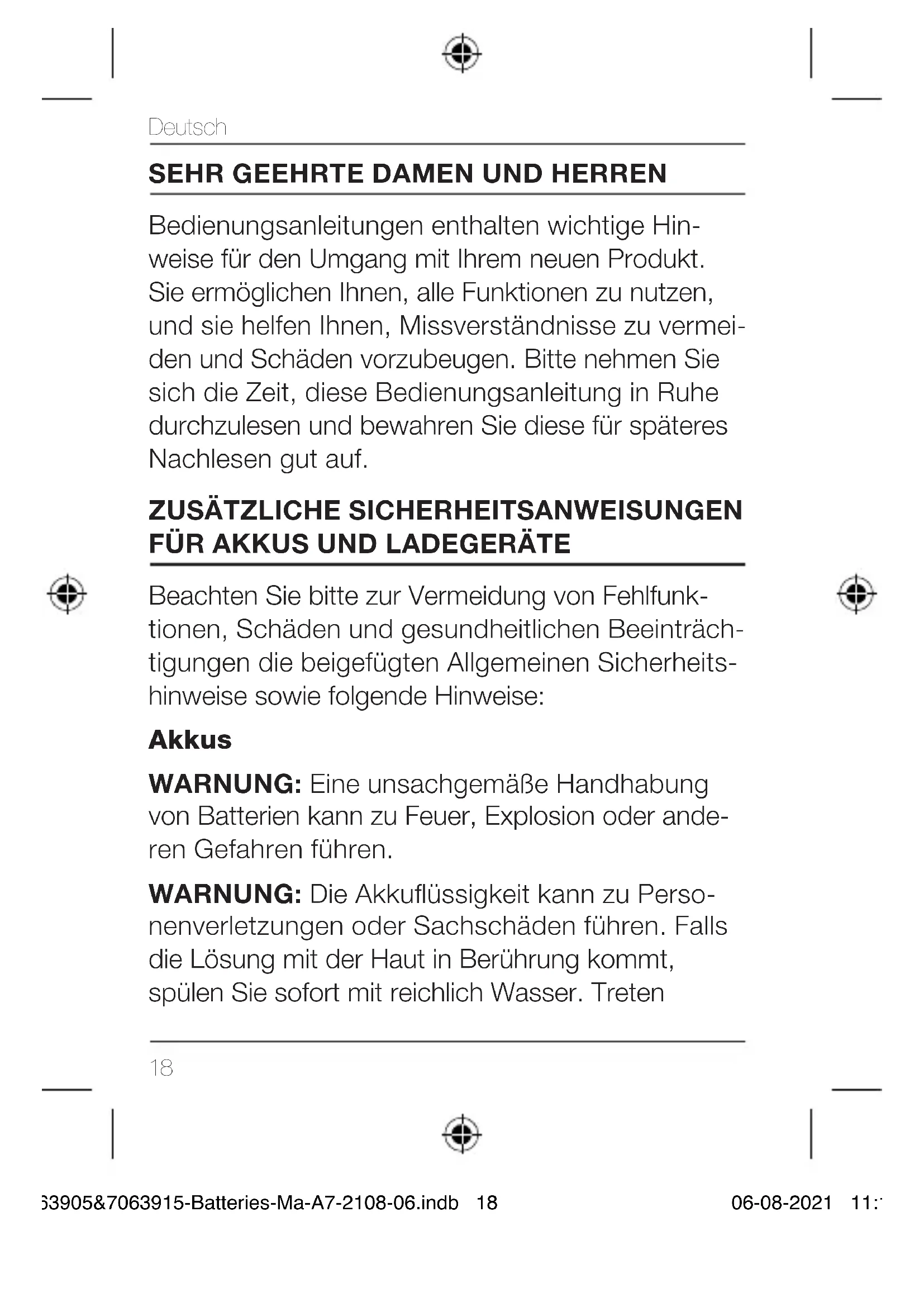 Beachten Sie bitte zur Vermeidung von Fehlfunk- tionen, Schäden und gesundheitlichen Beeinträch- tigungen die beigefügten Allgemeinen Sicherheits- hinweise sowie folgende Hinweise: Akkus WARNUNG: Eine unsachgemäße Handhabung von Batterien kann zu Feuer, Explosion oder ande- ren Gefahren führen. WARNUNG: Die Akkuüssigkeit kann zu Perso- nenverletzungen oder Sachschäden führen. Falls die Lösung mit der Haut in Berührung kommt, spülen Sie sofort mit reichlich Wasser. Treten 7063905&7063915-Batteries-Ma-A7-2108-06.indb 187063905&7063915-Batteries-Ma-A7-2108-06.indb 18 06-08-2021 11:1806-08-2021 11:1819 Deutsch