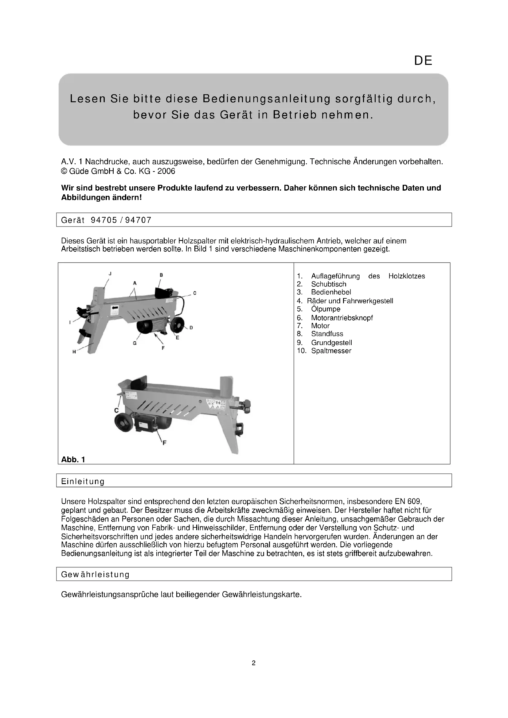 W5205T - Holzspalter Güde - Kostenlose Bedienungsanleitung