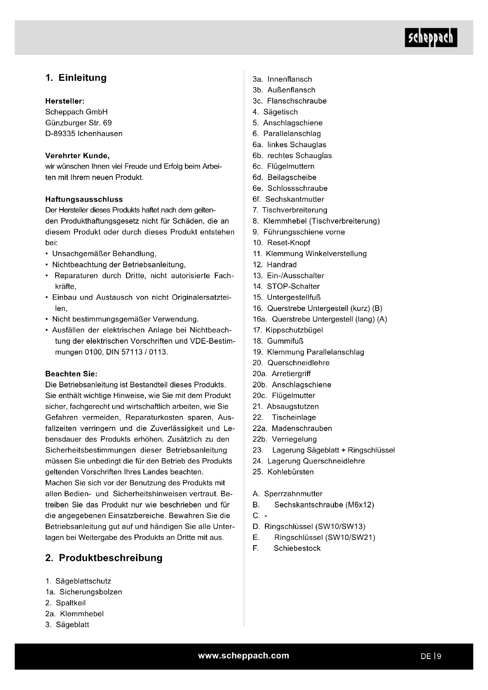 Hersteller: Scheppach GmbH Günzburger Str. 69 D-89335 Ichenhausen Verehrter Kunde, wir wünschen Ihnen viel Freude und Erfolg beim Arbei- ten mit Ihrem neuen Produkt. Haftungsausschluss Der Hersteller dieses Produkts haftet nach dem gelten- den Produkthaftungsgesetz nicht für Schäden, die an diesem Produkt oder durch dieses Produkt entstehen bei: