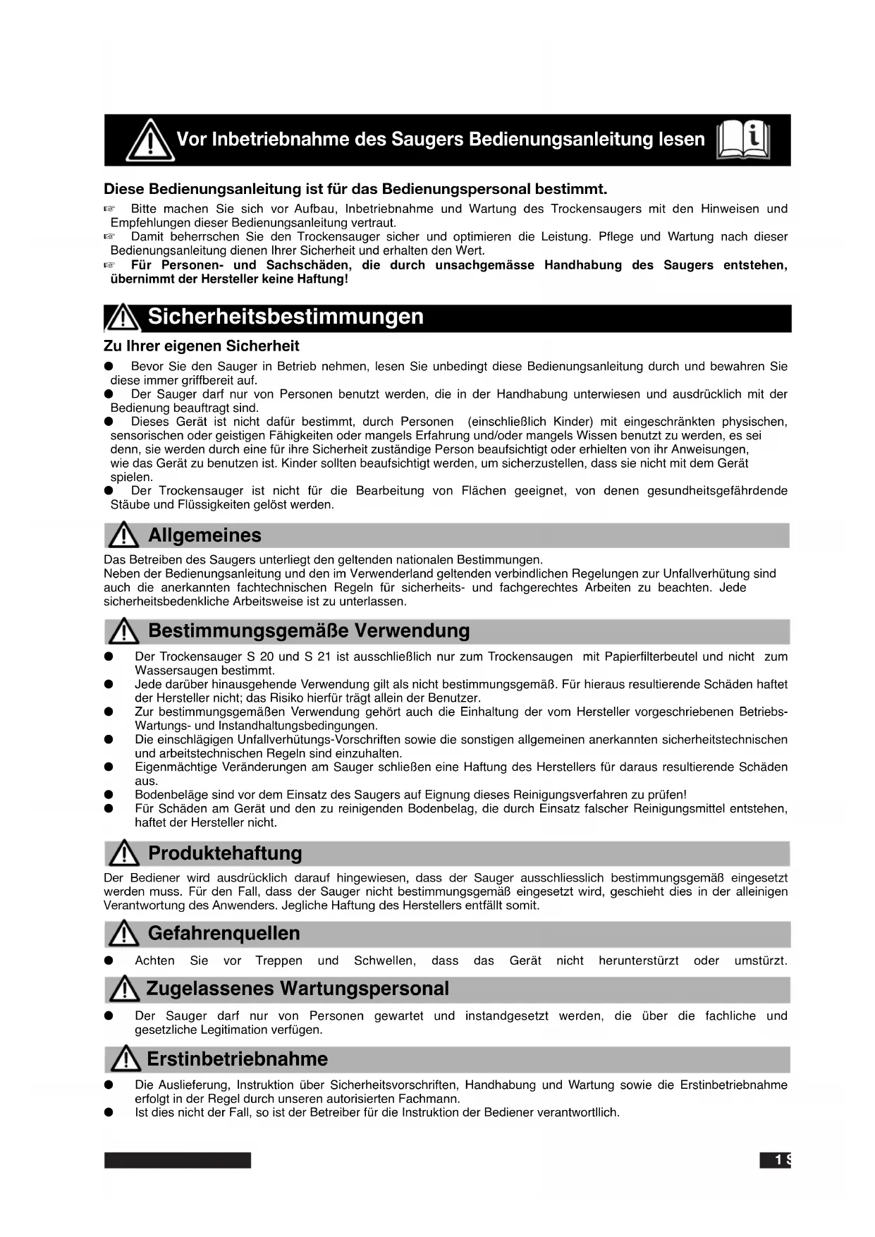 - Der Trockensauger S 20 und S 21 ist ausschließlich nur zum Trockensaugen mit Papierfilterbeutel und nicht zum Wassersaugen bestimmt.