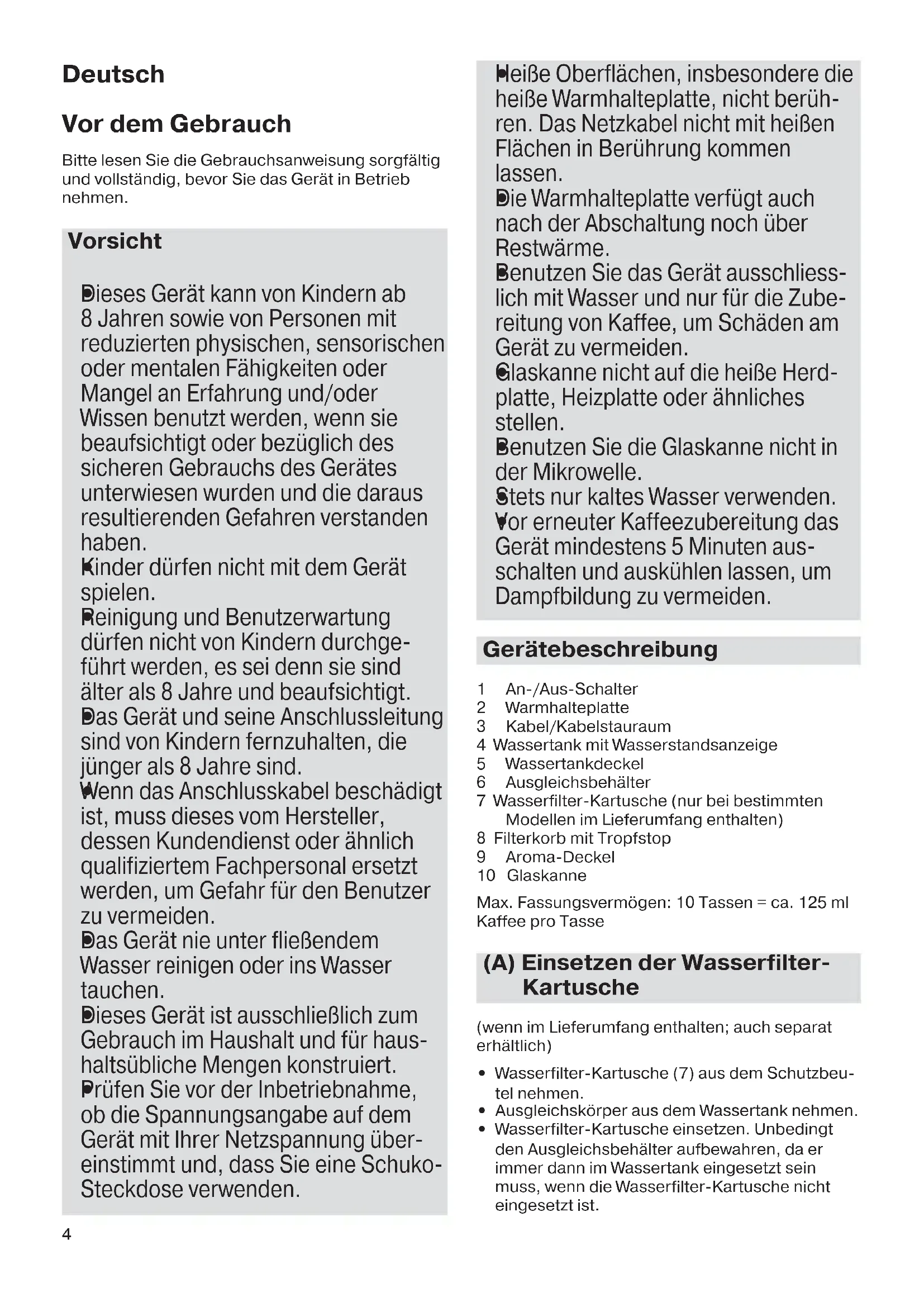 Vor erneuter Kaffeezubereitung das Gerät mindestens 5 Minuten aus- schalten und auskühlen lassen, um Dampfbildung zu vermeiden. Gerätebeschreibung 1 An-/Aus-Schalter 2 Warmhalteplatte 3 Kabel/Kabelstauraum 4 Wassertank mit Wasserstandsanzeige 5 Wassertankdeckel 6 Ausgleichsbehälter 7 Wasserfilter-Kartusche (nur bei bestimmten Modellen im Lieferumfang enthalten) 8 Filterkorb mit Tropfstop 9 Aroma-Deckel 10 Glaskanne Max. Fassungsvermögen: 10 Tassen = ca. 125 ml Kaffee pro Tasse (A) Einsetzen der Wasserfilter- Kartusche (wenn im Lieferumfang enthalten; auch separat erhältlich)